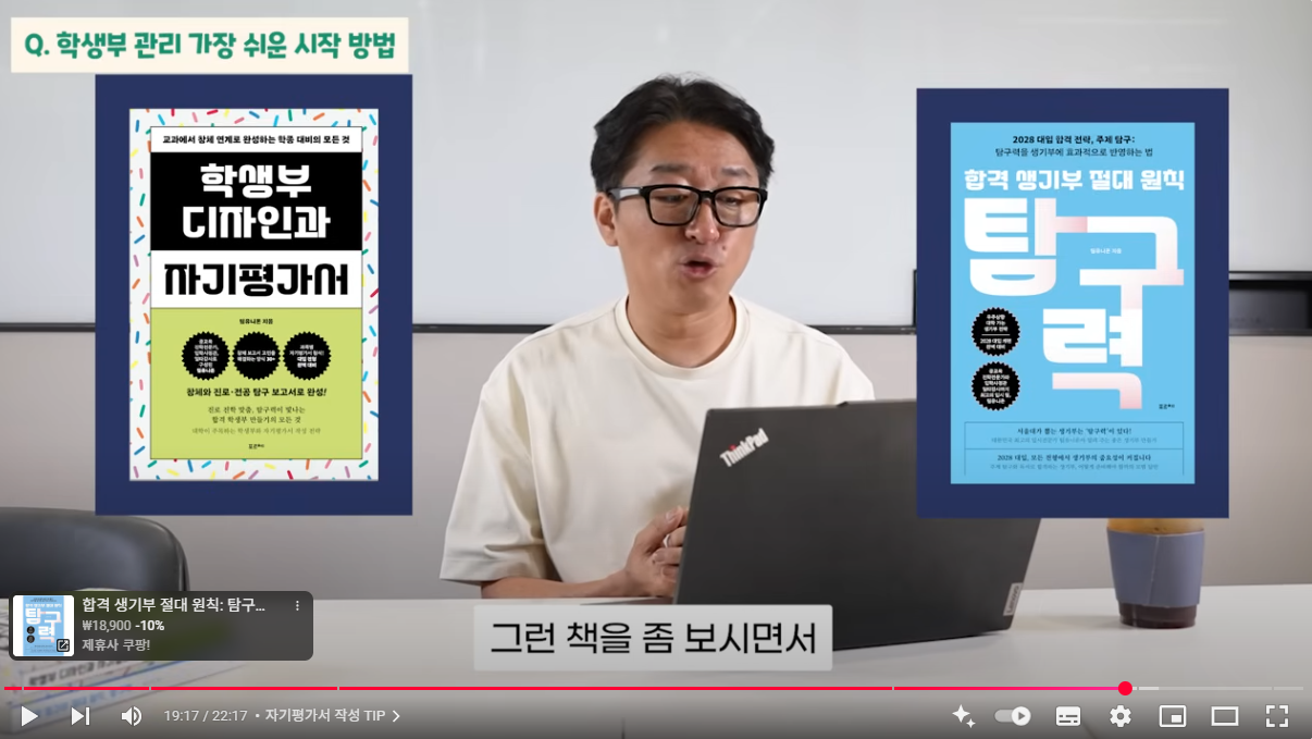 이 영상에서 소개한 책도 있는데 '학생부 디자인과 자기 평가서', '합격 생기부 절대 원칙 탐구력' 책이 있습니다. 학생부 디자인과 자기 평가서는 생기부 관리를 전반적으로 어떻게 하면 좋을지, 수행 평가를 어떤 식으로 관리하면 좋을지에 대한 내용이 들어 있습니다. 탐구력 책은 그래서 수행 평가를 할 때 어떤 탐구를 어떤 식으로 하면 좋을지 구체적인 사례 내용이 들어 있어서 주제를 잡기 어렵거나 탐구를 어떻게 할지 모를 때 예시로 보면 좋을 것 같습니다.