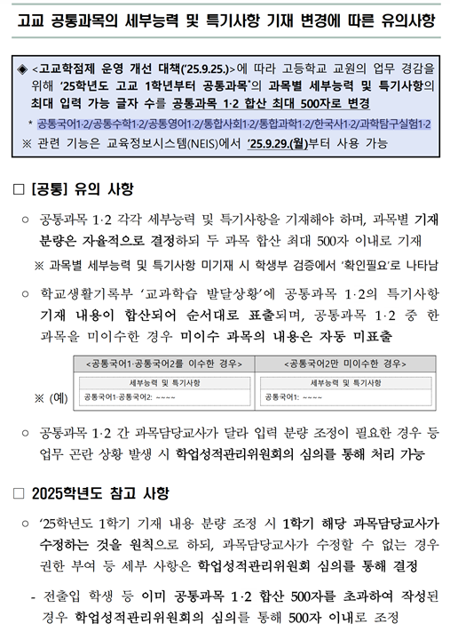 최근에 발표된 '고교학점제 운영 개선대책(25.9.25)'으로 공통과목 세특 글자수가 조정되어 올해 고1 아이들 1학기 세특 내용 변경된다고 합니다. 안 그래도 고등학교 학교생활기록부 어떻게 관리