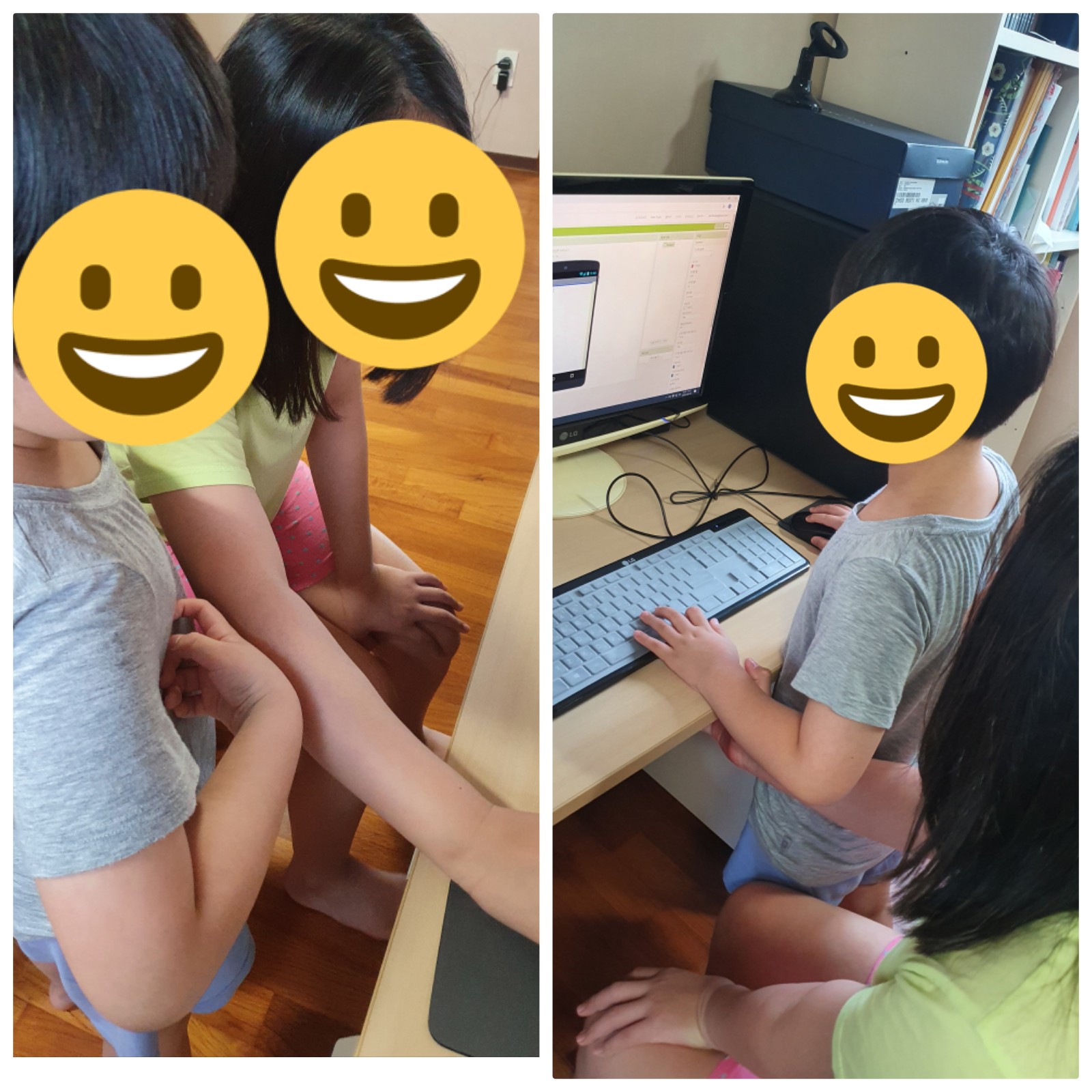 강의 들은 후 아이들이 열심히 어플 만들어보는 중입니다~ 다 만든 후 핸드폰과 연결하니 바로 어플 작동시켜 볼 수 있더라구요! 또 연결된 상태에서 앱인벤터로 수정하니 실시간으로 어플이 변경되어서 신기했어요ㅎㅎ