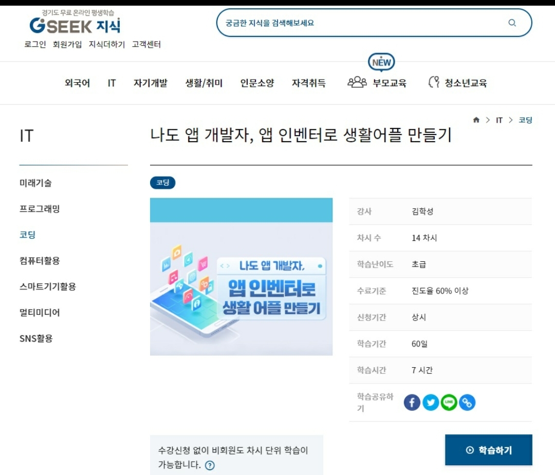 들어가서 앱인벤터를 검색하니 바로 강의가 나오더라구요 ^^