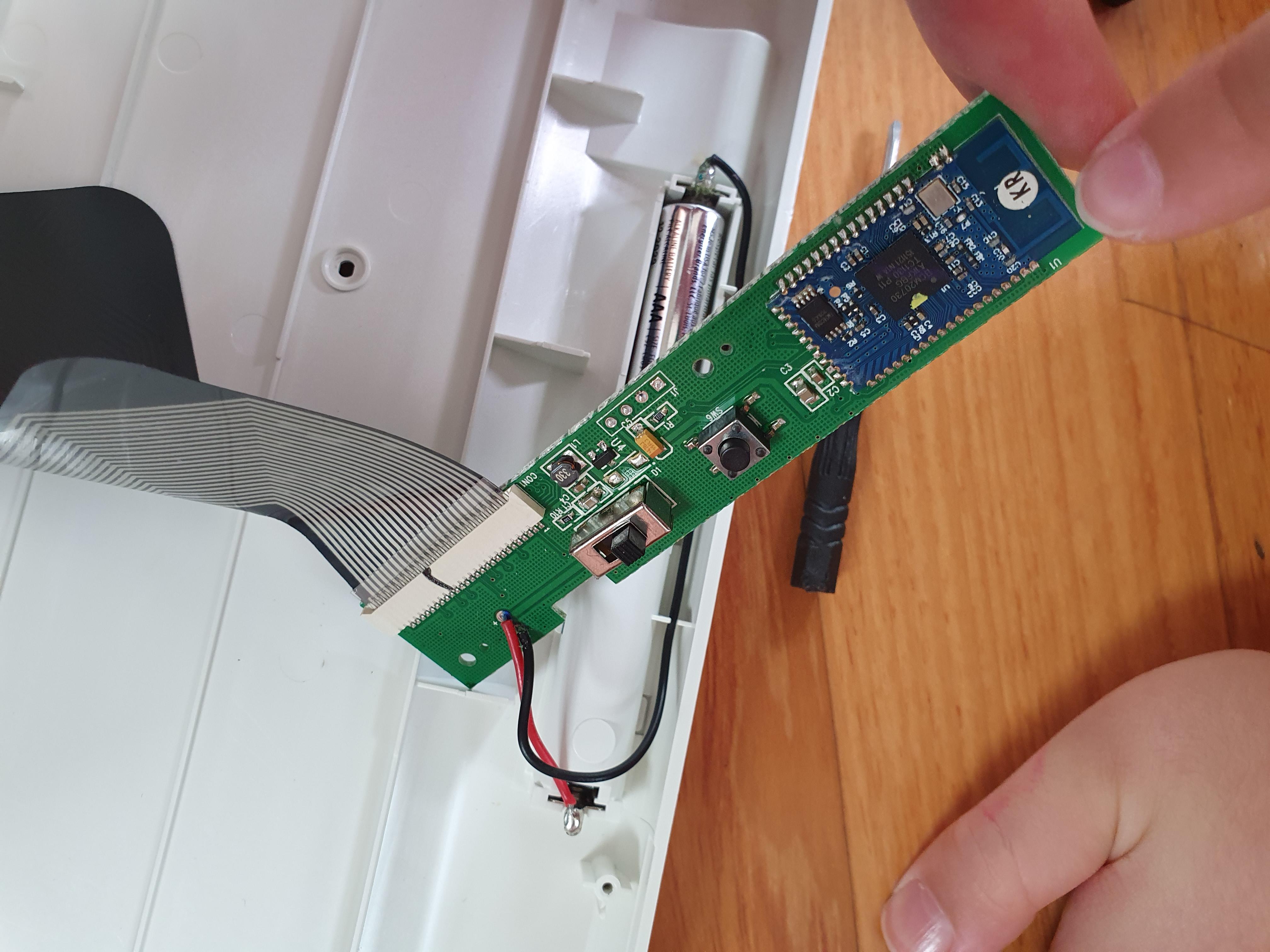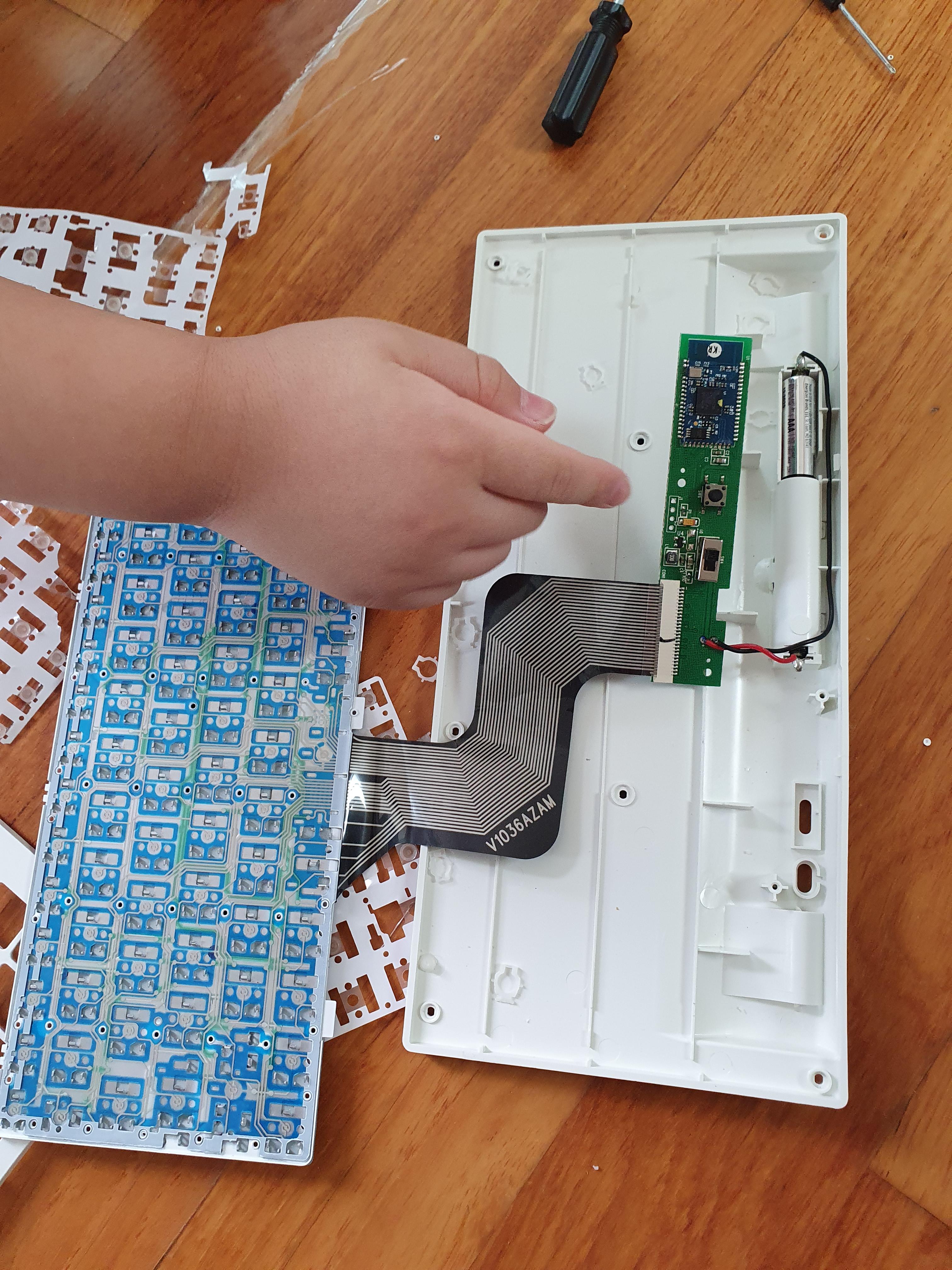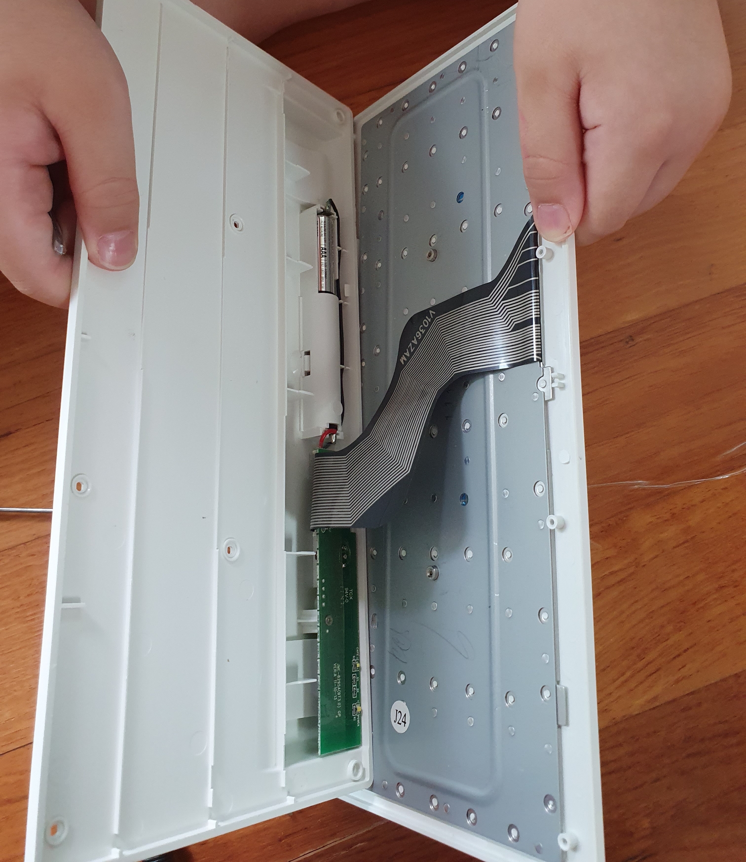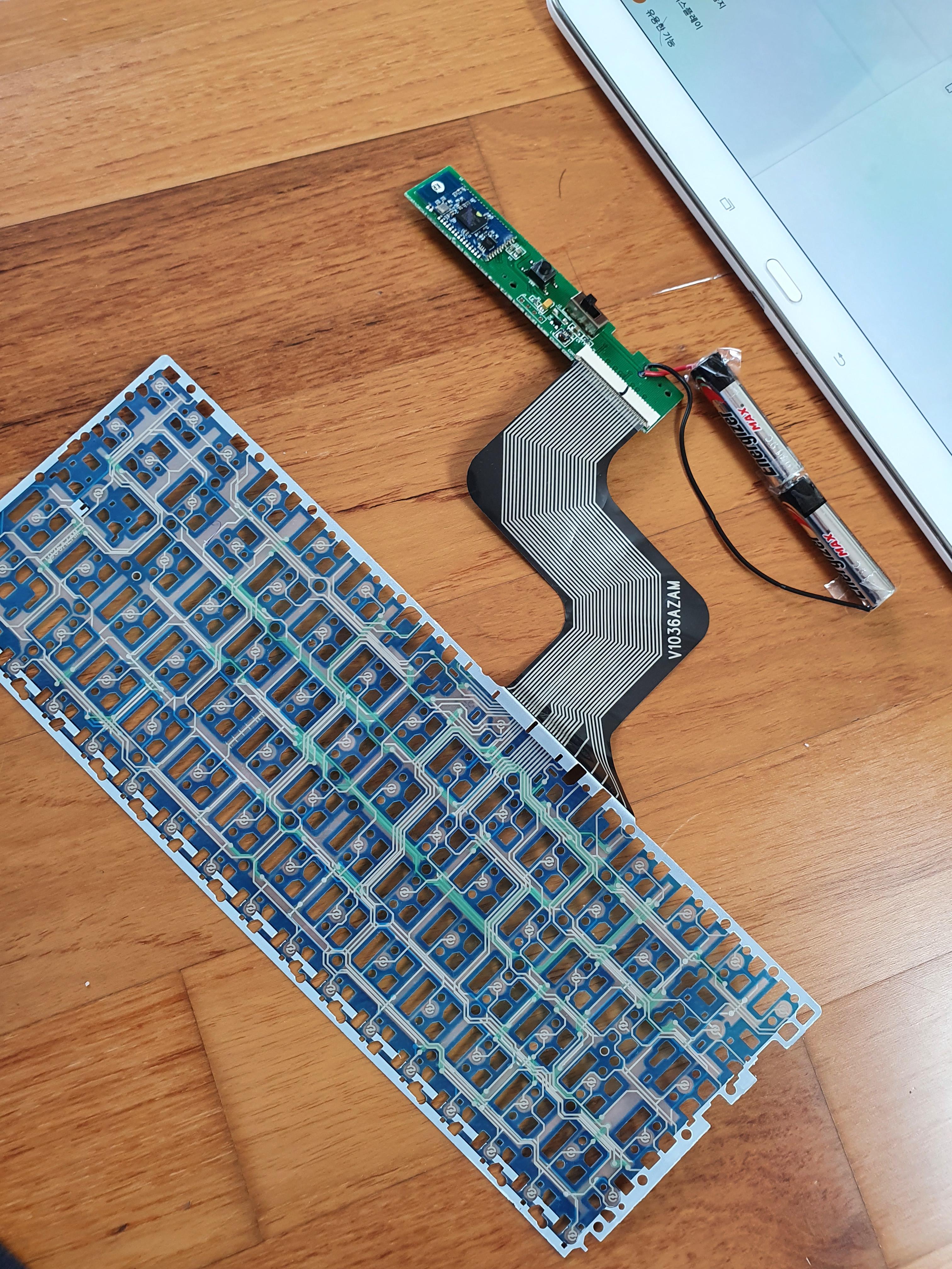 오오! 흰 필름 제거하니 우리가 키를 누르면 실제로 신호를 인식하는 부분이 보여요! 그럼 그 부분이 눌리면 하얀 선을 따라 메인 보드로 가서 컴퓨터나 태블릿으로 신호를 보내는 건가봐요! 메인보드에서 건전지로 연견되는 전원 전선도 보이네요ㅎㅎ
