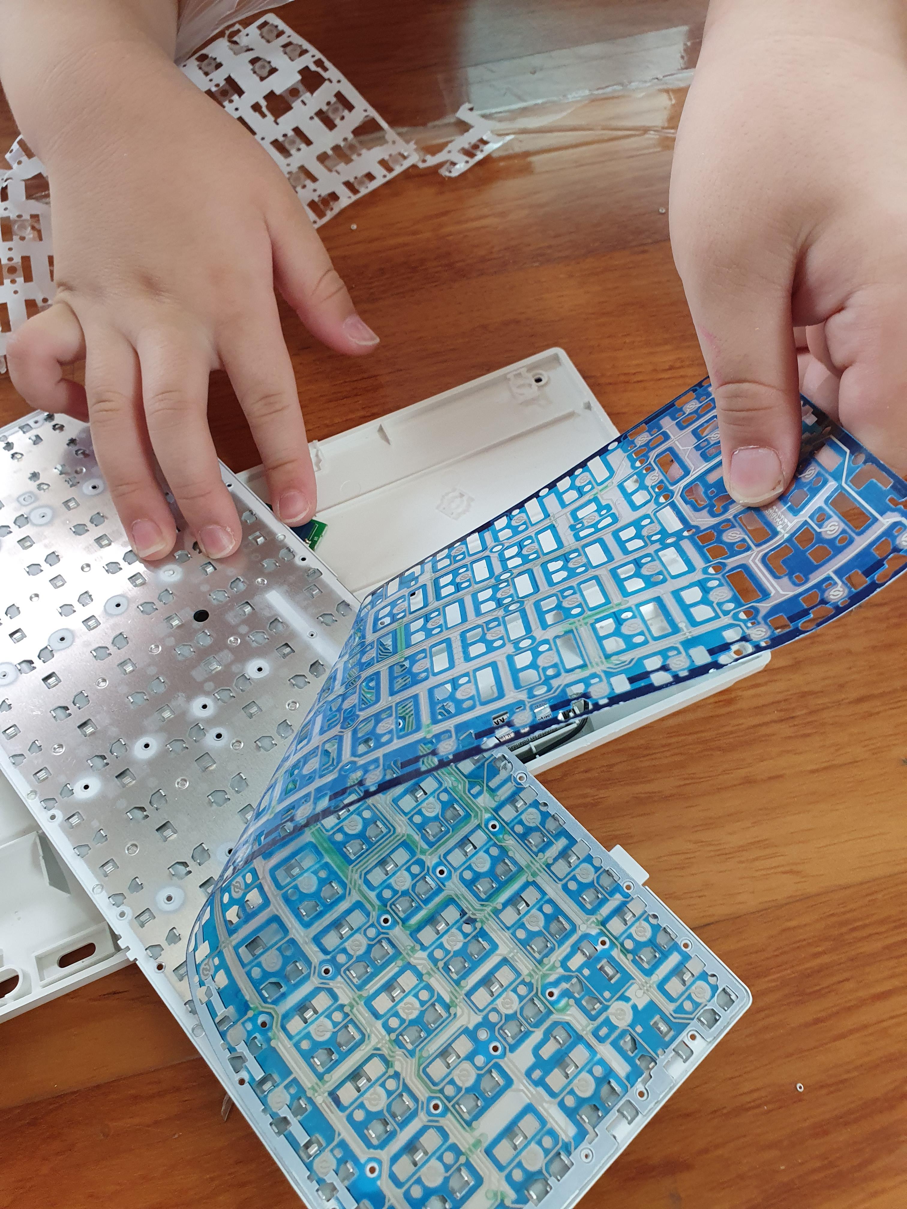 보니 아래판은 또 한장의 필름으로 덮여있는데요. 키를 누를때 눌렸다 올라가게 하는 장치들이 덮여있어서 이것도 제거해서 이 필름도 제거해봅니다!