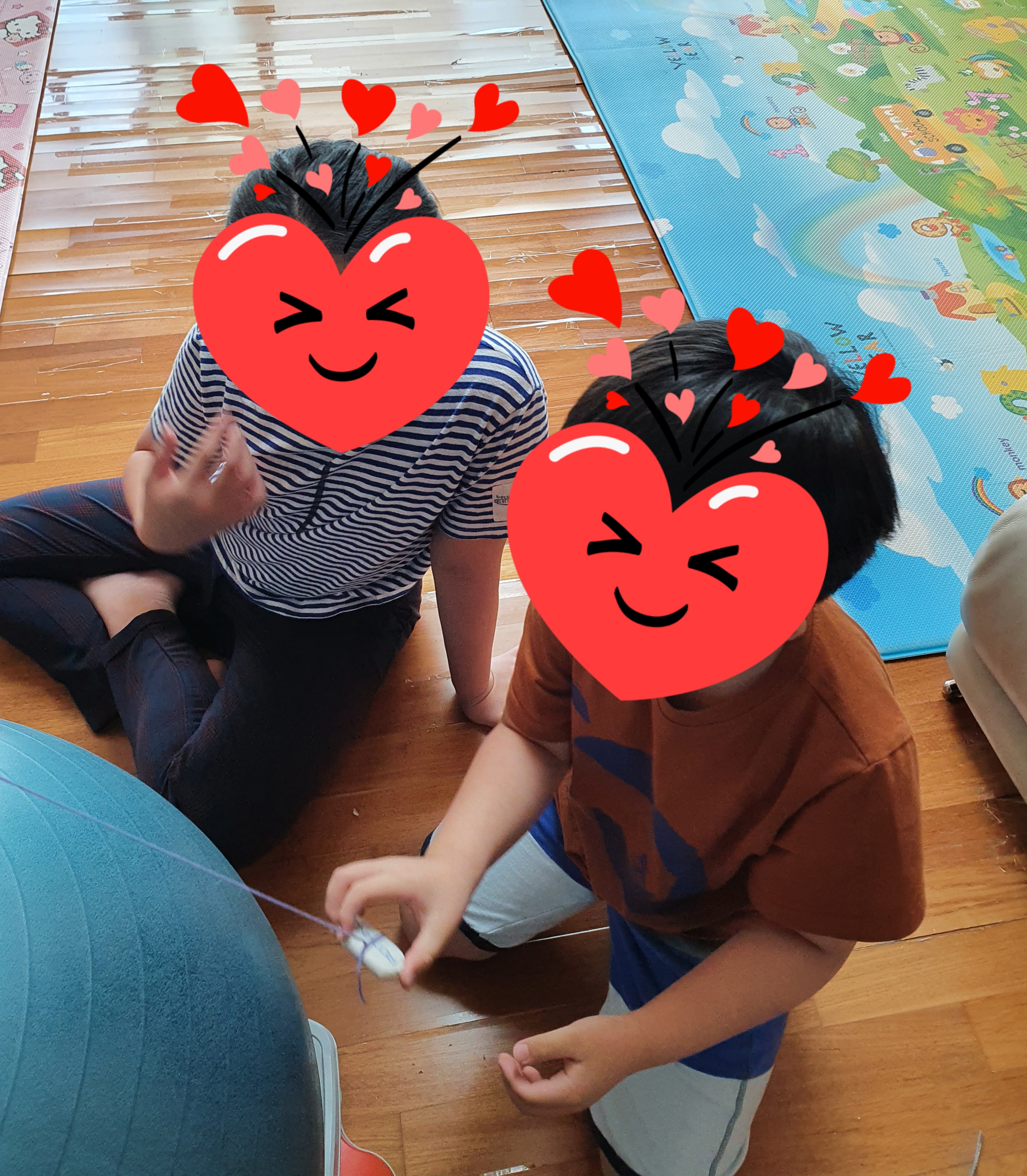 자료 중간에 보니 커다란 짐볼을 지구, 끈에 달린 지우개를 우주선으로 보고 탈출속도를 실험해보는 게 있더라구요. 간단하기도 하고 재미도 있을 것 같아서 바로 해봤습니다ㅋ