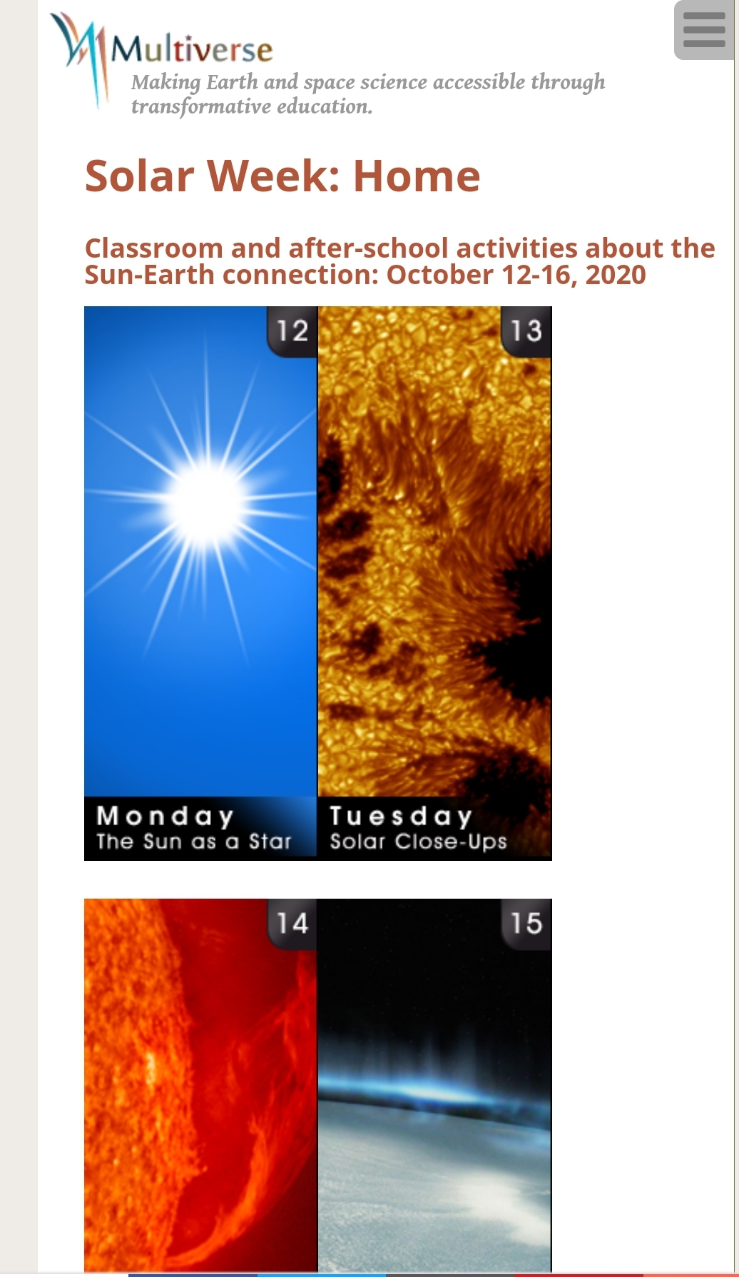 Classroom and after-school activities about the Sun-Earth connection: October 12-16, 2020 Monday - The Sun As a Star Tuesday - Solar Close-Ups Wednesday- The Active Sun Thursday - The Sky Above: Earth's Upper Atmosphere Friday - Solar Careers, Internships