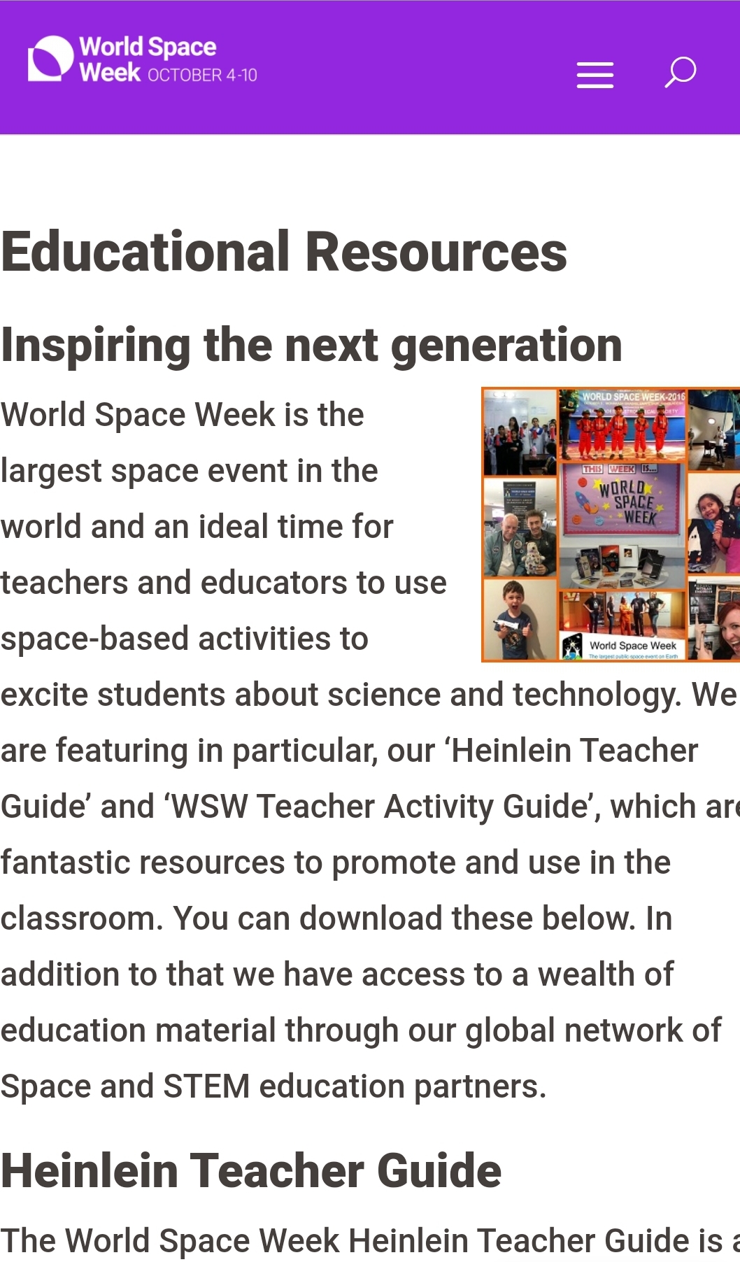 Educational Resources Inspiring the next generation World Space Week is the largest space event in the world and an ideal time for teachers and educators to use space-based activities to excite students about science and technology. We are featuring in par
