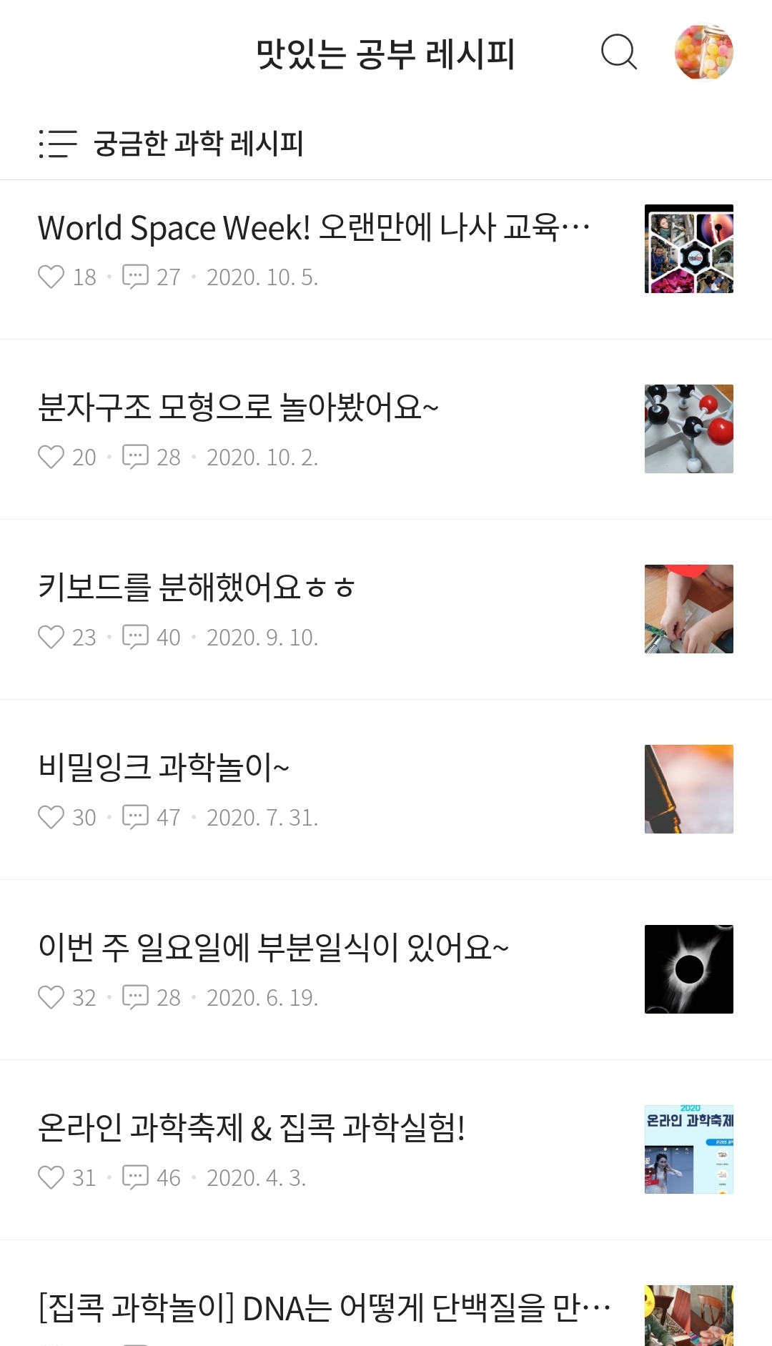 이 블로그의 궁금한 과학레시피 게시판을 캡쳐한 거에요. 제가 과학실험을 좋아하다 보니 이것저것 많이도 해봤네요^^; 역시 집에서 해보면 흥미유발은 잘 되고 좋은데요. 여기에서 실험보고서를 써보고 정리해서 이론적인 내용을 배우는 부분은 아무래도 좀 약해요. 해본 실험들 중 보고서까지 마무리한 것도 있지만 진짜로 그냥 놀아본 것도 많거든요ㅋㅋㅋ