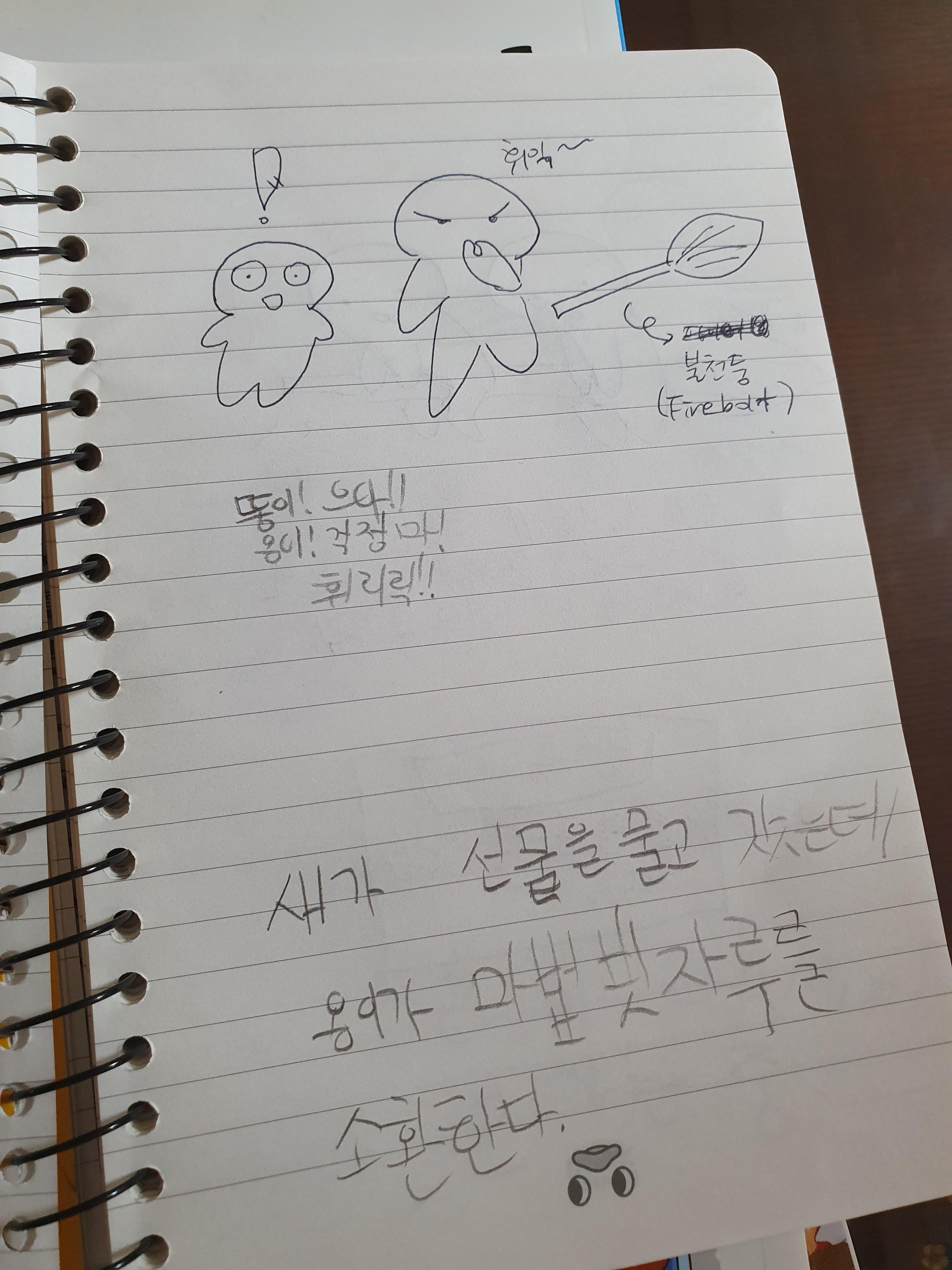 그래서 저희는 이런 걸 시도해보고 있어요. 먼저 아이가 상황을 상상하고 어떤 그림을 그려달라고 하면 그림을 먼저 그려주는거죠. 여기에 마음껏 글을 써달라고 하면 위의 그림처럼 대화를 써놔요. 그럼 이게 무슨 상황인지 설명하는 문장을 써달라고 했더니 이렇게 쓰더라구요. 이렇게 훈련하다 보면 나중엔 점차 스스로 배경설명도 하는 날이 올거라 믿습니다^^