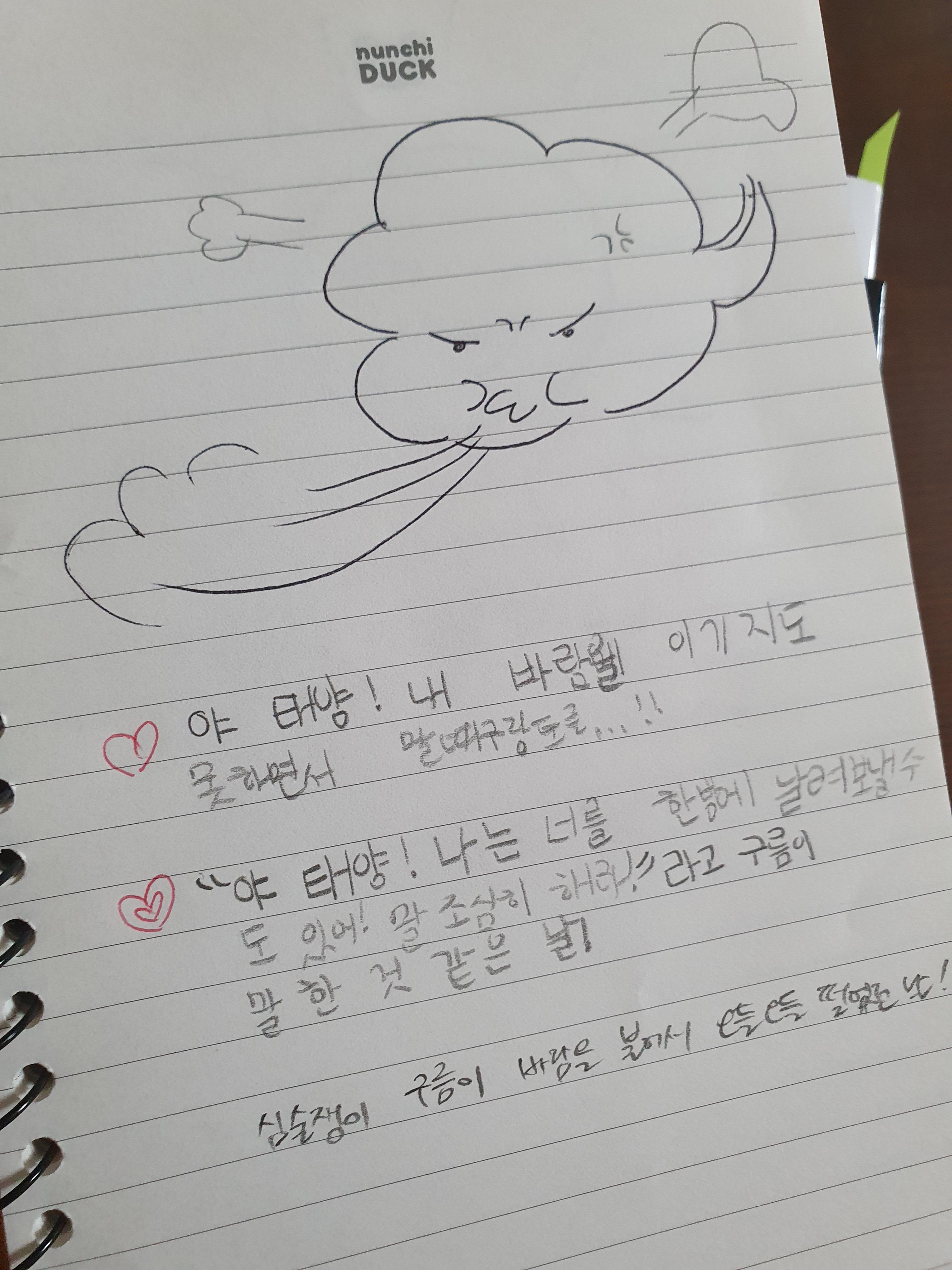 요즘은 날씨를 맑음, 흐림 등의 단어로 쓰지 않고 문장으로 표현하더라구요. 그러면서 일상의 주변을 보다 세심하게 관찰하고 표현해보는 연습을 하는 거래요. 그런데 이것도 연습이 필요하긴 해서요ㅎㅎ 아이와 날씨에 대해 그림을 그리면서 표현해봤어요. 그림은 아이의 요구사항에 따라 제가 그려준 거구요^^ 이렇게 그림을 그린걸 보더니 구름이 하는 대사만 이야기 하길래 그걸 포함해서 문장이 되도록, 다른 사람이 읽어도 어떤 상황인지 이해할 수 있도록 다시 써보기도 했어요