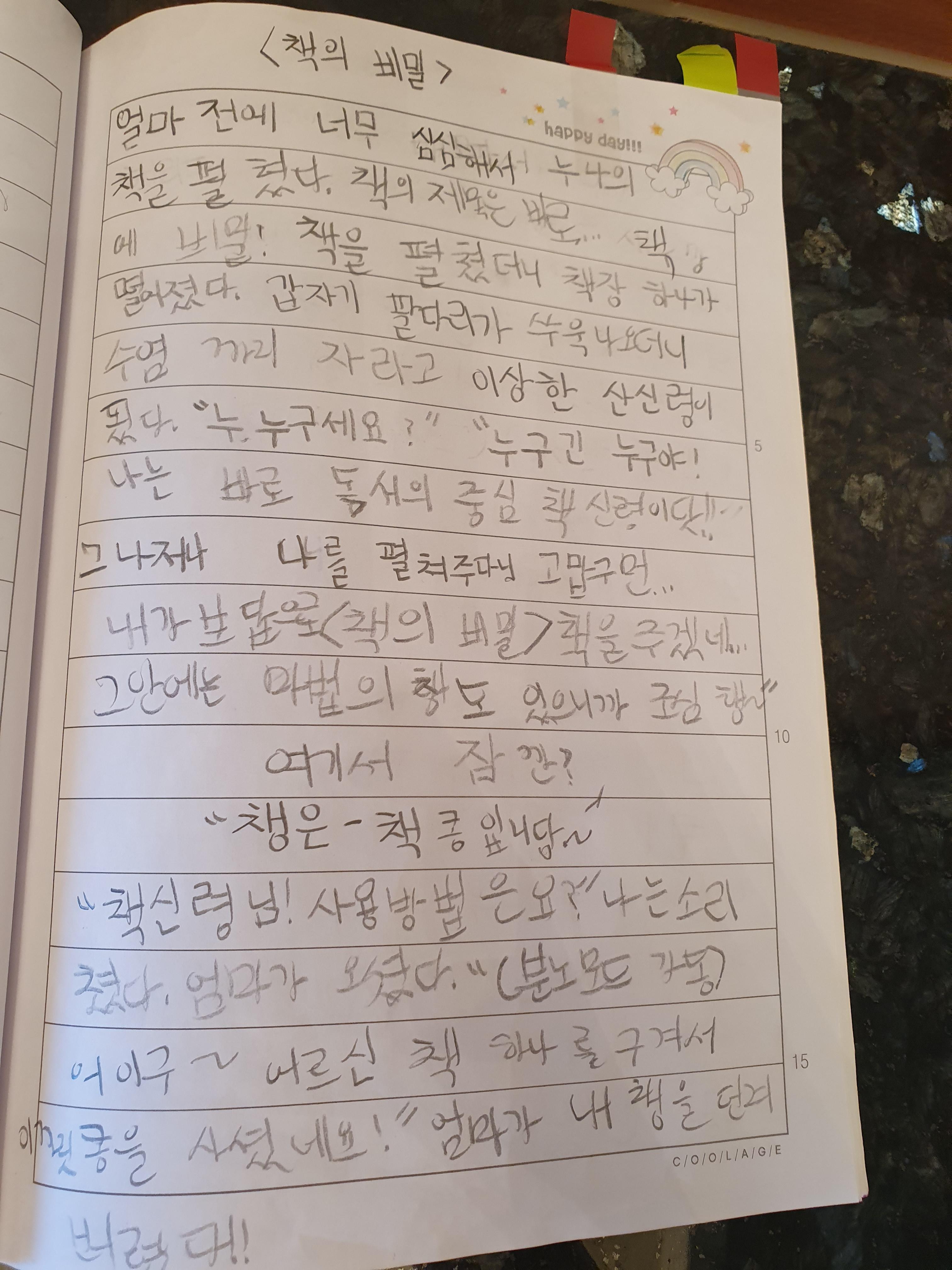 이건 가장 최근에 쓴 상상일기인데요. 나름 설명을 하면서 시작하다가 중간쯤 가면 대화로만 이야기가 전개되지요? 아하하^^; 다음장으로 넘어가면 책콩에서 거대한 책나무가 자라나는 이야기가 펼쳐진답니다~ ㅎㅎ 상상은 참 재밌게 했어요. 여기에 이해하기 쉽도록 대화 말고 설명을 좀더 붙이면 좋을것 같아요. 그치만 그건 차차 하도록 하고 지금은 신나는 이야기 키득거리며 읽으면서 재밌다고 우쭈쭈 칭찬해줍니다~ 아직 저학년이니 지금 필요한 건 자신감과 흥미, 꾸준히 하려는 태도니까요^^