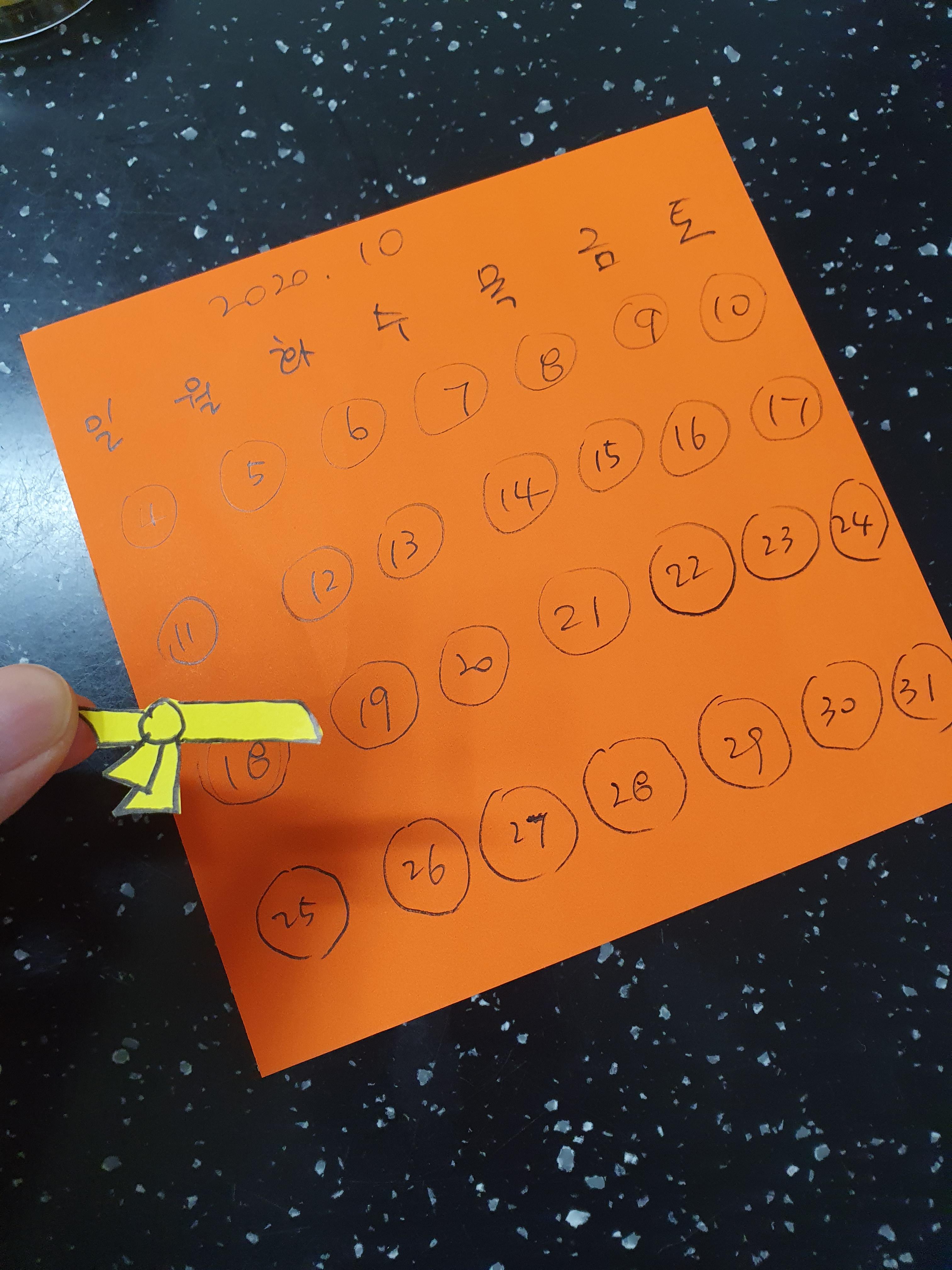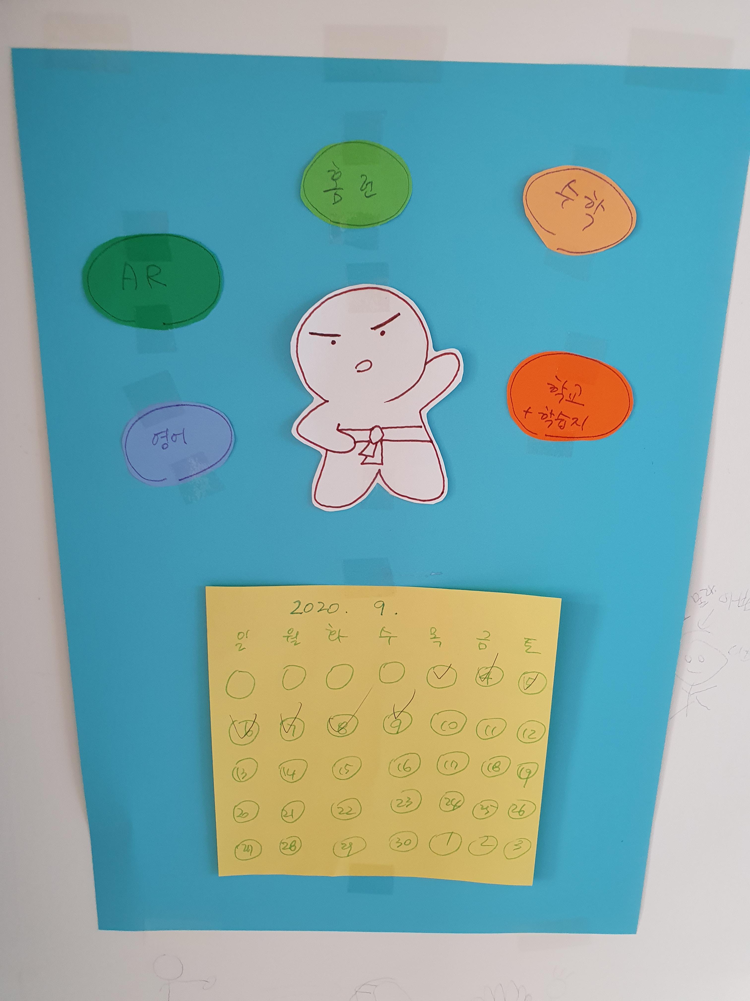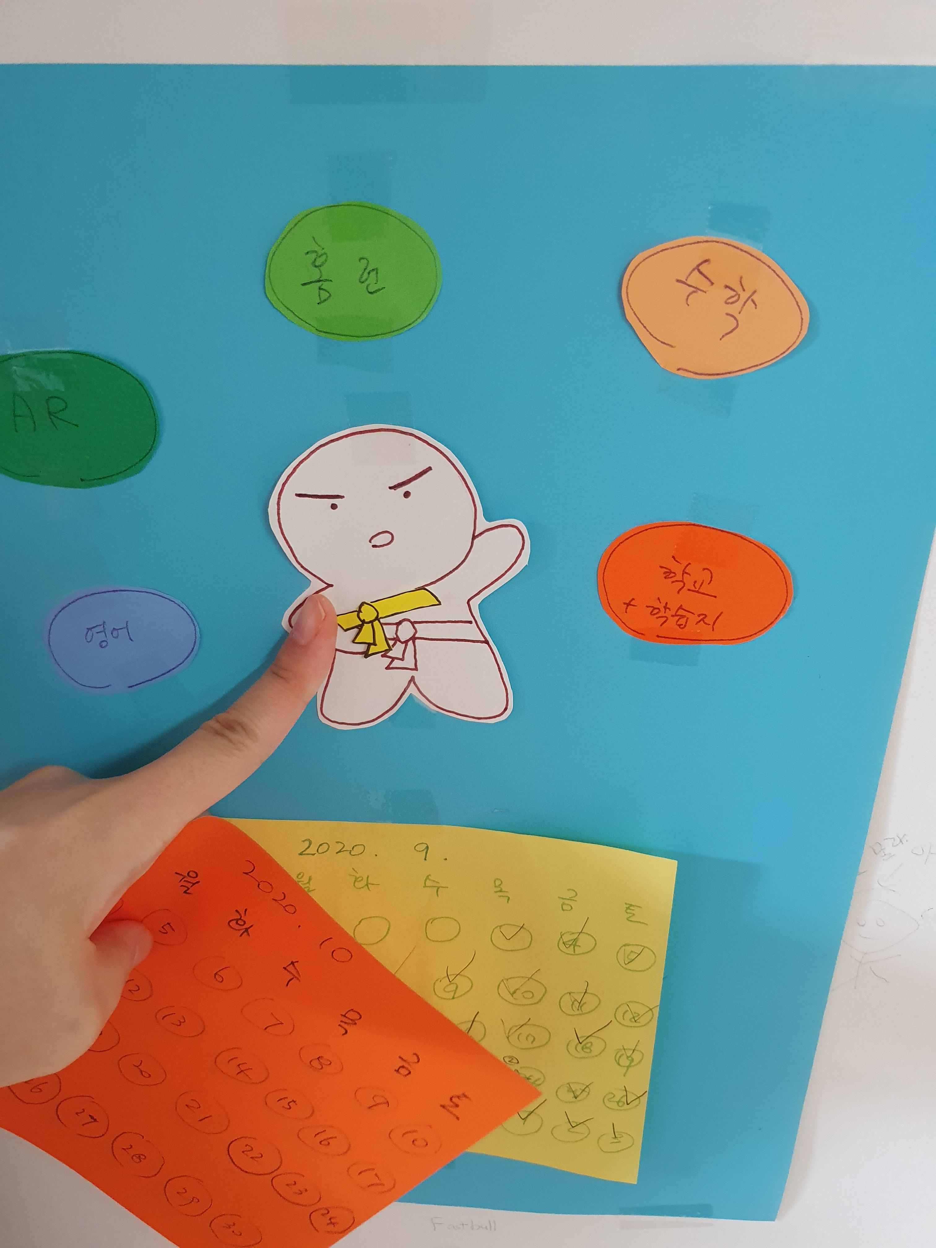 9월 한달 잘 마무리해서 10월 달력으로 바꾸면서 노란 띠로 올려줬어요~ 계속 승급해서 검은 띠가 되면 아이스크림 축하파티 하기로 했어요~ ㅎㅎ