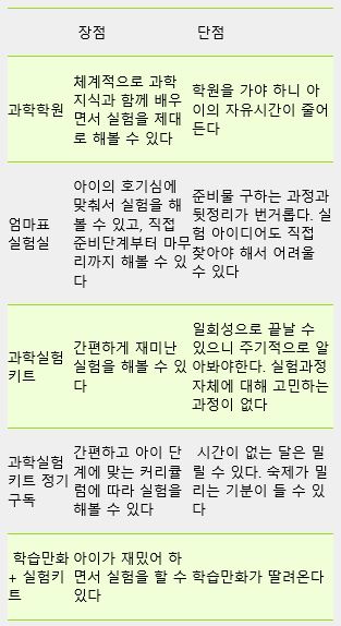 예전에 아이 과학학원을 보낼지 집에서 그냥 실험해볼지 고민하면서 정리해봤던 여러 가지 과학 실험 진행 방법에 대한 장단점 정리입니다. 이건 개인적인 의견이니 참고하시는 정도로만 봐주세요 ^^