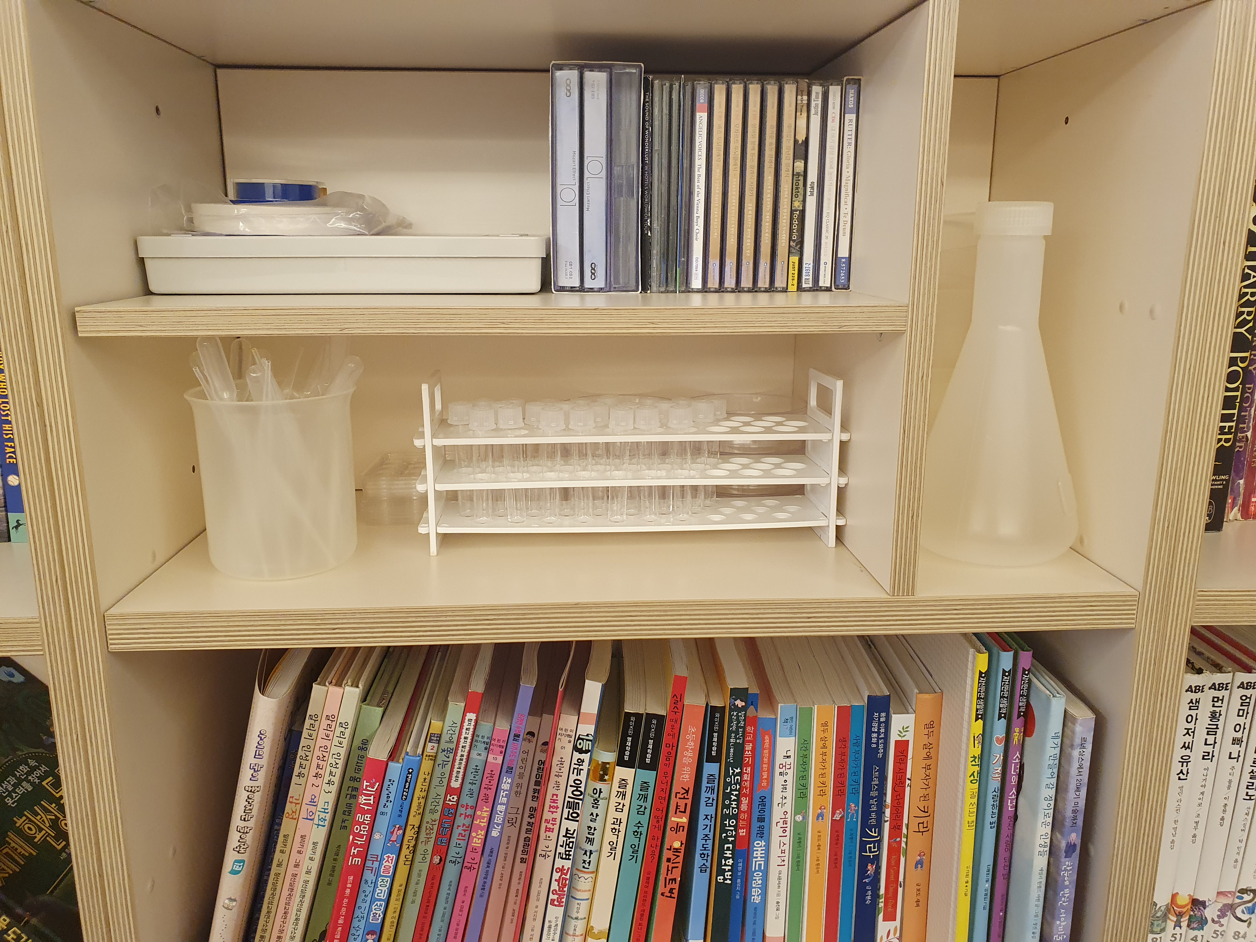 우리 집 실험실이라고 하면 거창한데 사실은 정리 바구니 하나에 쏙 들어가는 정도였거든요. 그런데 이번에 장만하면서 책장 칸을 비워서 여기에 정리해봤어요. 뭔가 멋지지 않나요? 눈에 보이면 더 쓰고 싶어지니 이렇게 정리해놓으면 더 자주 실험을 하고싶어질 것 같아요 ㅎㅎ