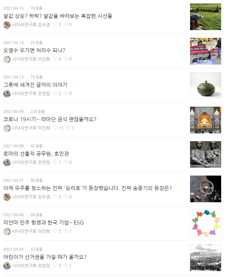 최신 글 목록 가져왔어요. 그때 그때 흥미로운 이슈들에 대해 아이들과 볼만한 글을 올려주시니 한번씩 보기 괜찮은 것 같아요. 어린이 신문도 보고 있는데 신문에 나온 내용과 여기 내용을 살펴보면서 서로 어떤 관점에서 하나의 사건을 보는지에 대해 살펴보는 것도 재밌는 것 같아요.