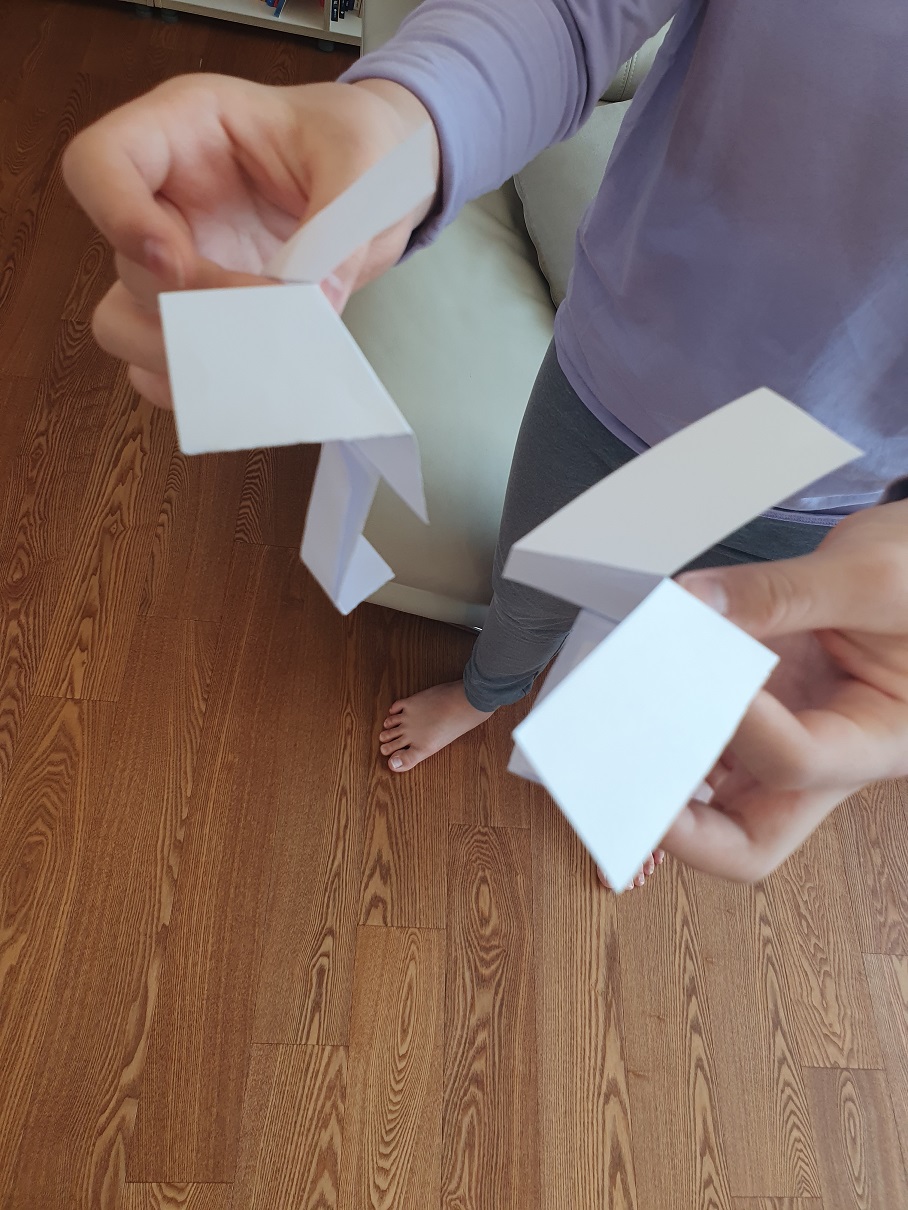 첫째는 한 번 만들어보더니 날개 길이를 좀 다르게 변형해서 어떤 게 더 잘 나는지 보고 싶어 하더라구요. 그래서 이렇게 변형도 해봤습니다. 역시 예상대로 날개가 좀 긴게 잘 날았어요 ㅎㅎ 사실 동력이 없어서 난다기 보다 천천히 떨어진다고 해야 할까요? 빙글빙글 돌아가며 떨어지는 종이 헬기, 간단하고 쉬워서 집에서 해보기 괜찮은 놀이였습니다 ㅎㅎ 그럼 다음에 또 재미난 이야기 가지고 올게요~
