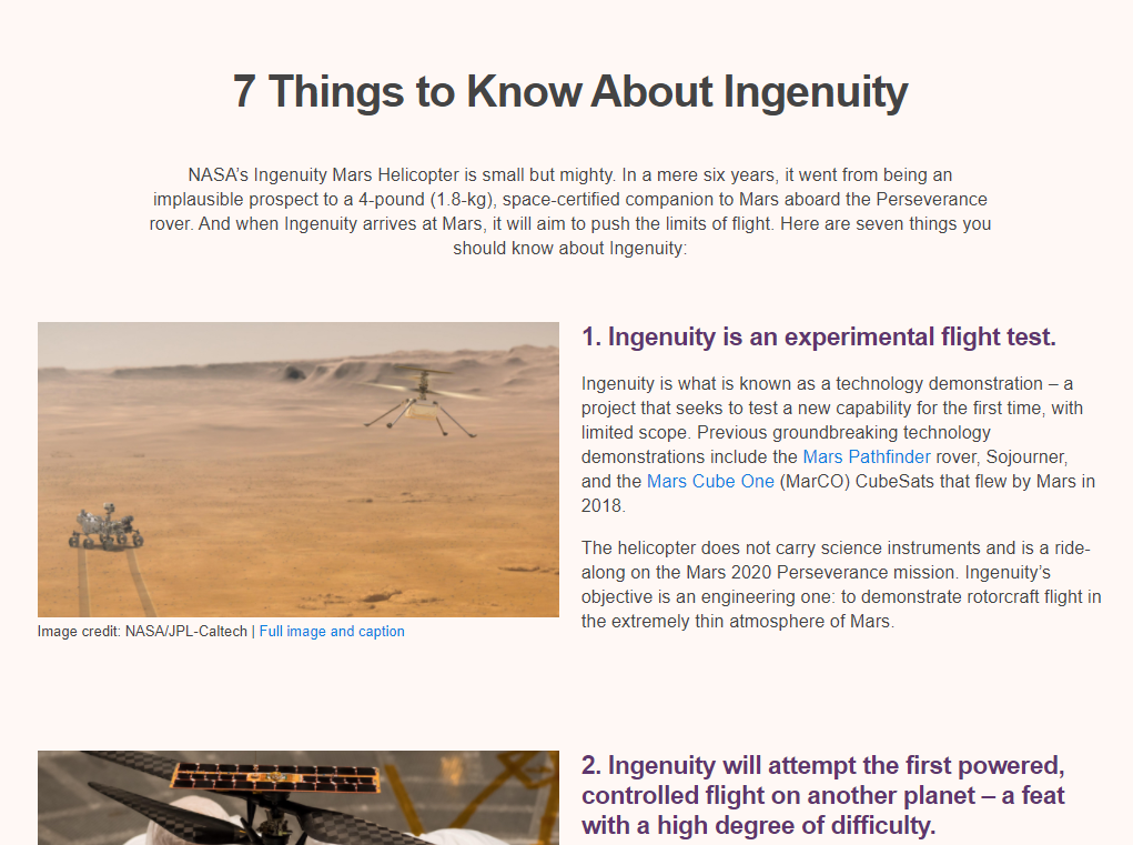 Ingenuity에 관련해서 볼만한 자료들이 있어서 가지고 와봤어요. 위의 링크 들어가시면 Ingenuity에 대한 7가지 알아야 할 점에 대해 볼 수 있어요~ 일단 Ingenuity는 다른 과학적 기구를 갖추고 있진 않고 순수하게 비행 가능성을 테스트하기 위해 만들어졌다고 하네요. 그 밖에 다른 사실들에 대해서도 보고 싶으시다면 위의 링크 들어가시면 되겠습니다~