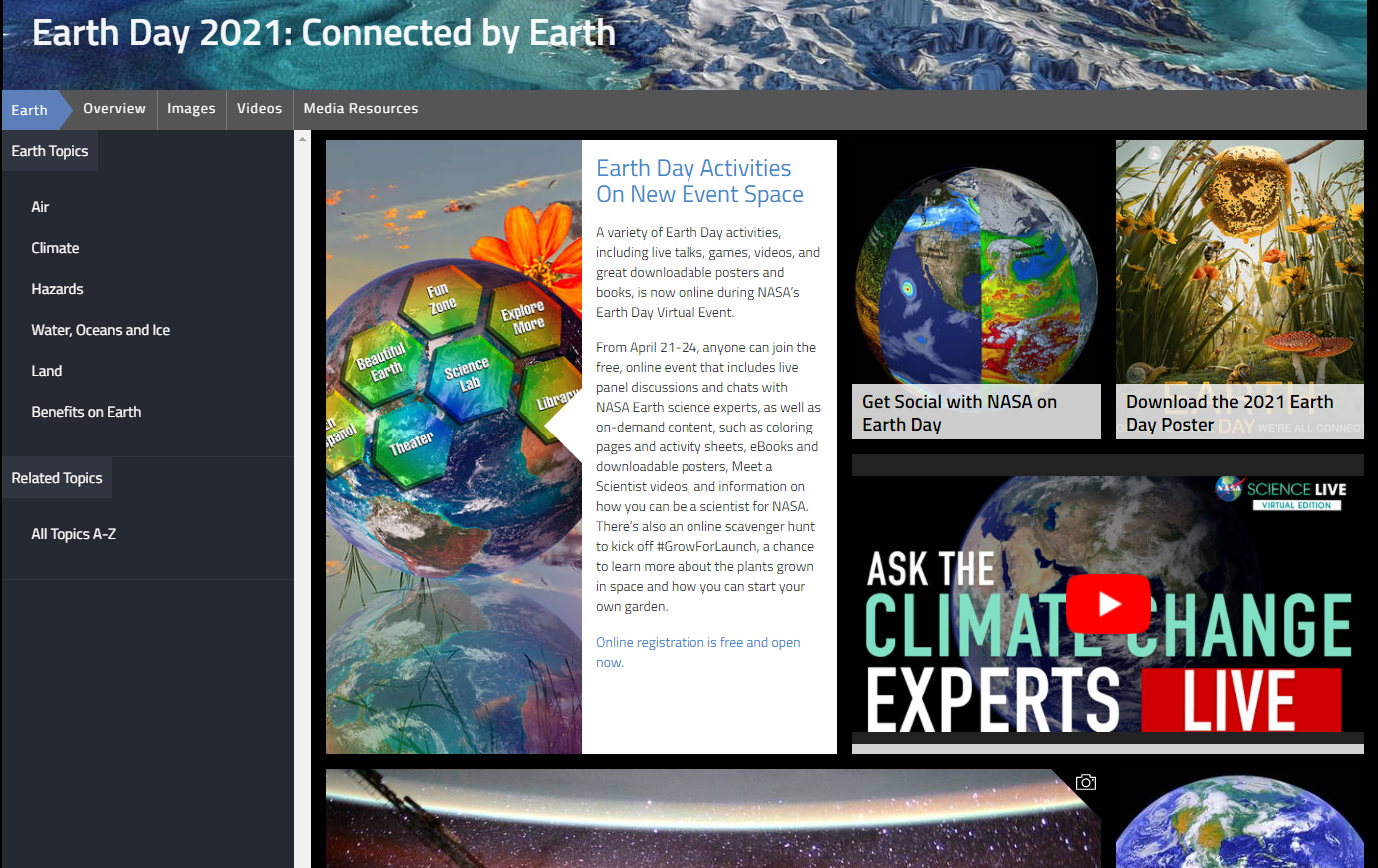 A variety of Earth Day activities, including live talks, games, videos, and great downloadable posters and books, is now online during NASA’s Earth Day 2021 Virtual Event.
