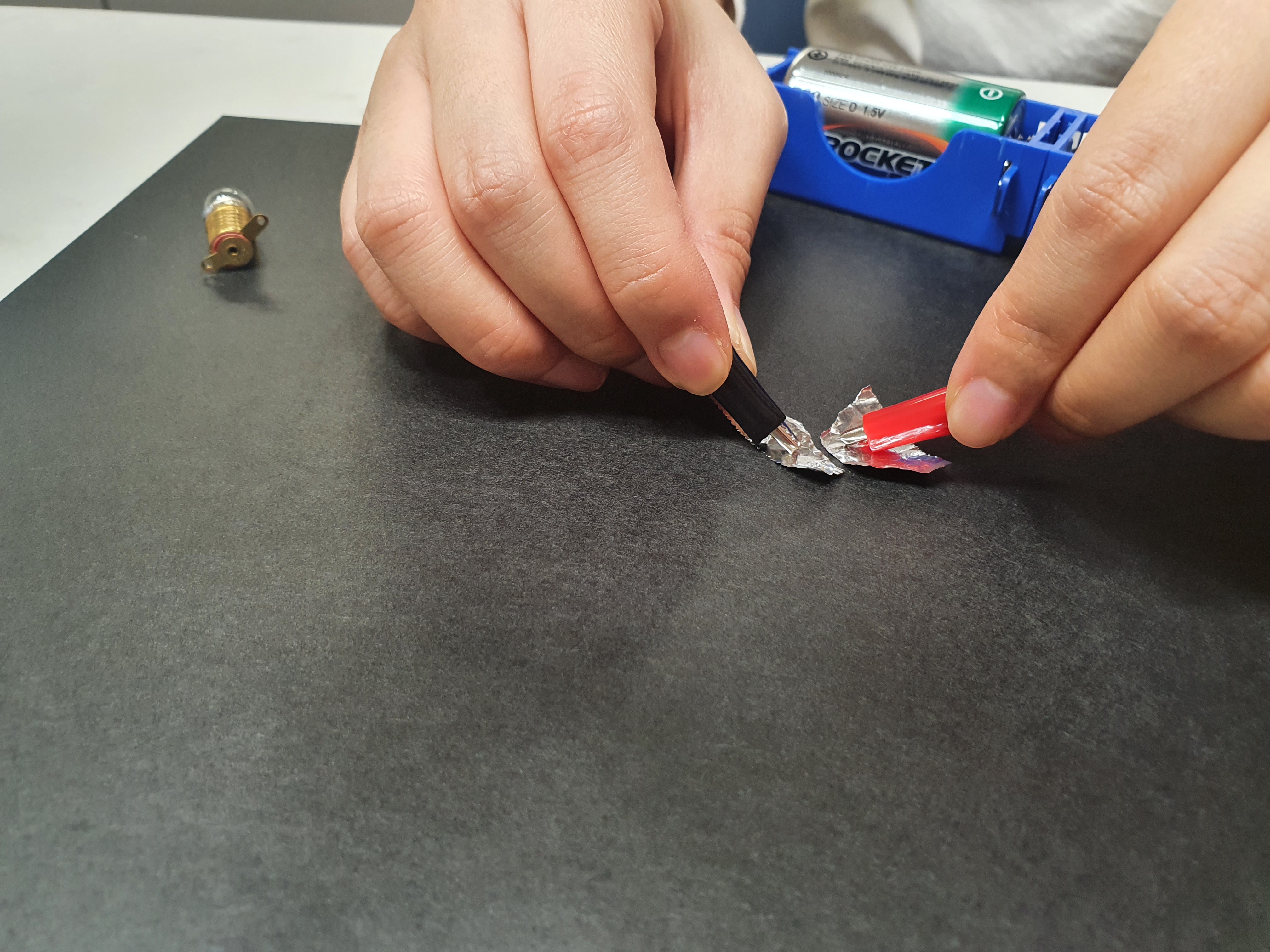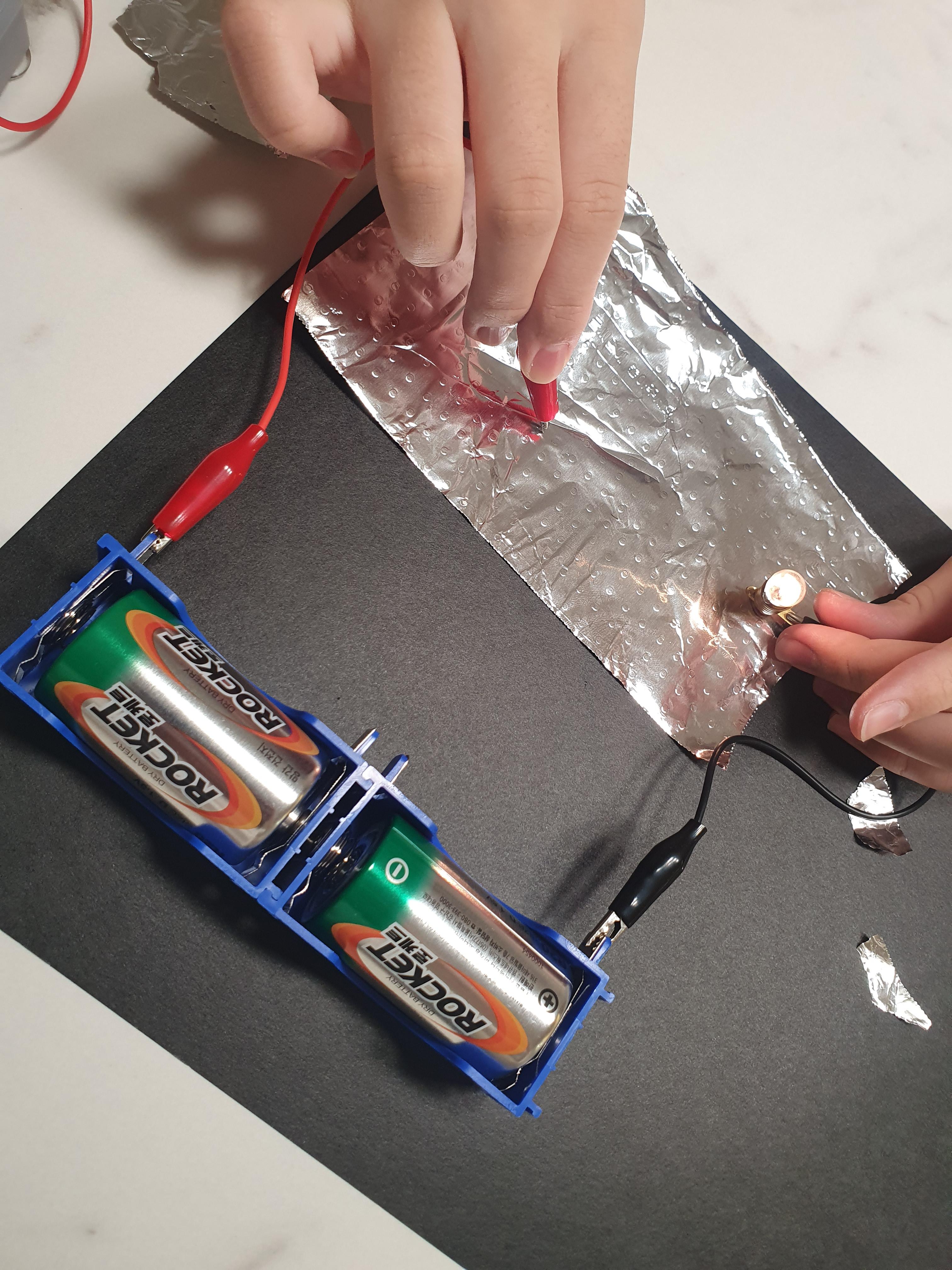 첫째가 학교에서 과학시간에 실험한 전기 키트랑 쿠킹호일을 준비했어요. 쿠킹호일이 진짜 전기가 통하는지 확인해보기 위해 꼬마전구 연결했는데 불이 잘 켜지네요^^ 번개를 만들려면 전력이 세야할 것 같아서 건전지도 직렬로 연결했습니다!