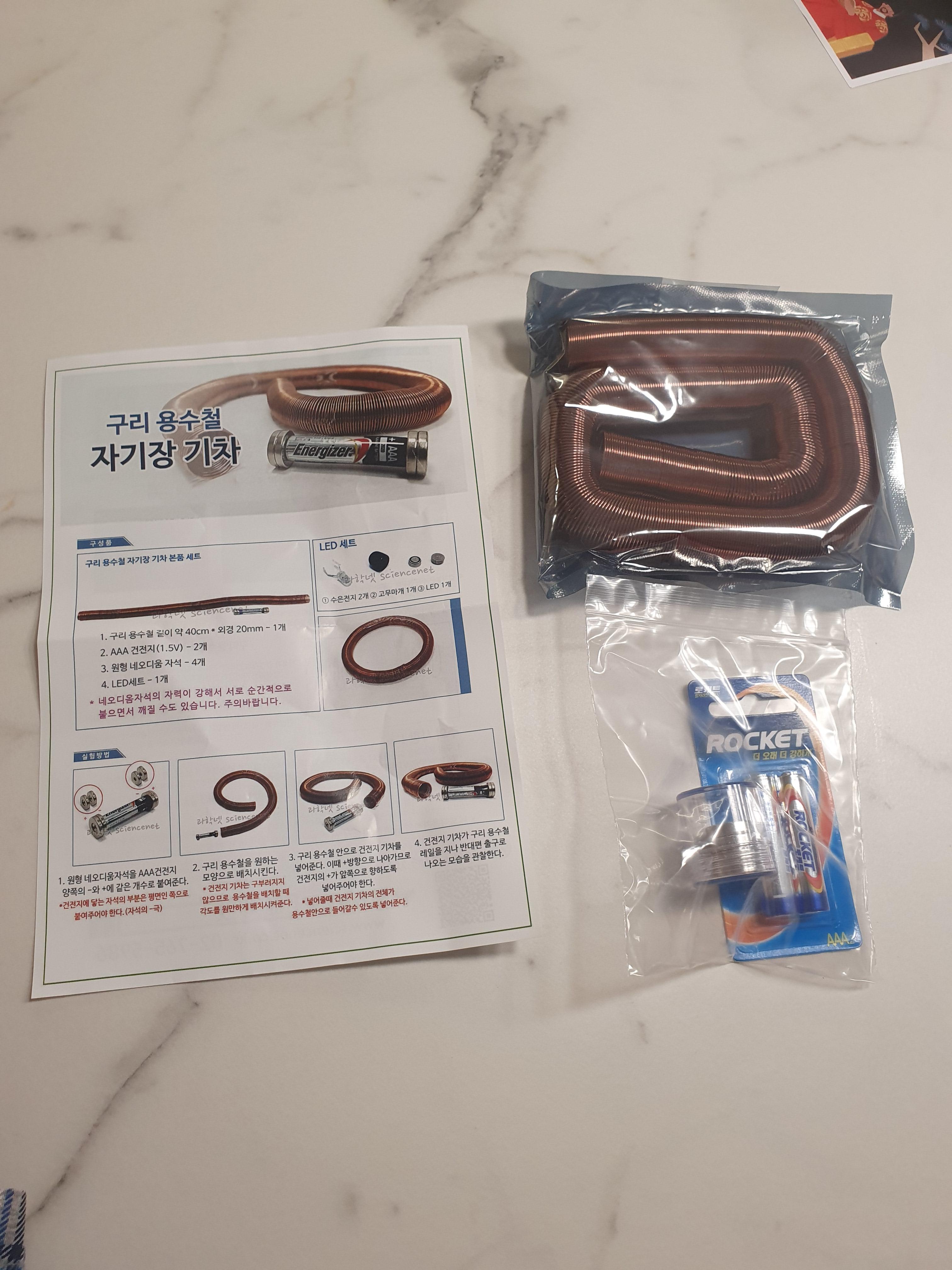 받은 키트를 열어보니 구리선으로 만든 용수철, 건전지, 자석이 들어있었어요. 재료는 간단하죠? ㅎㅎ