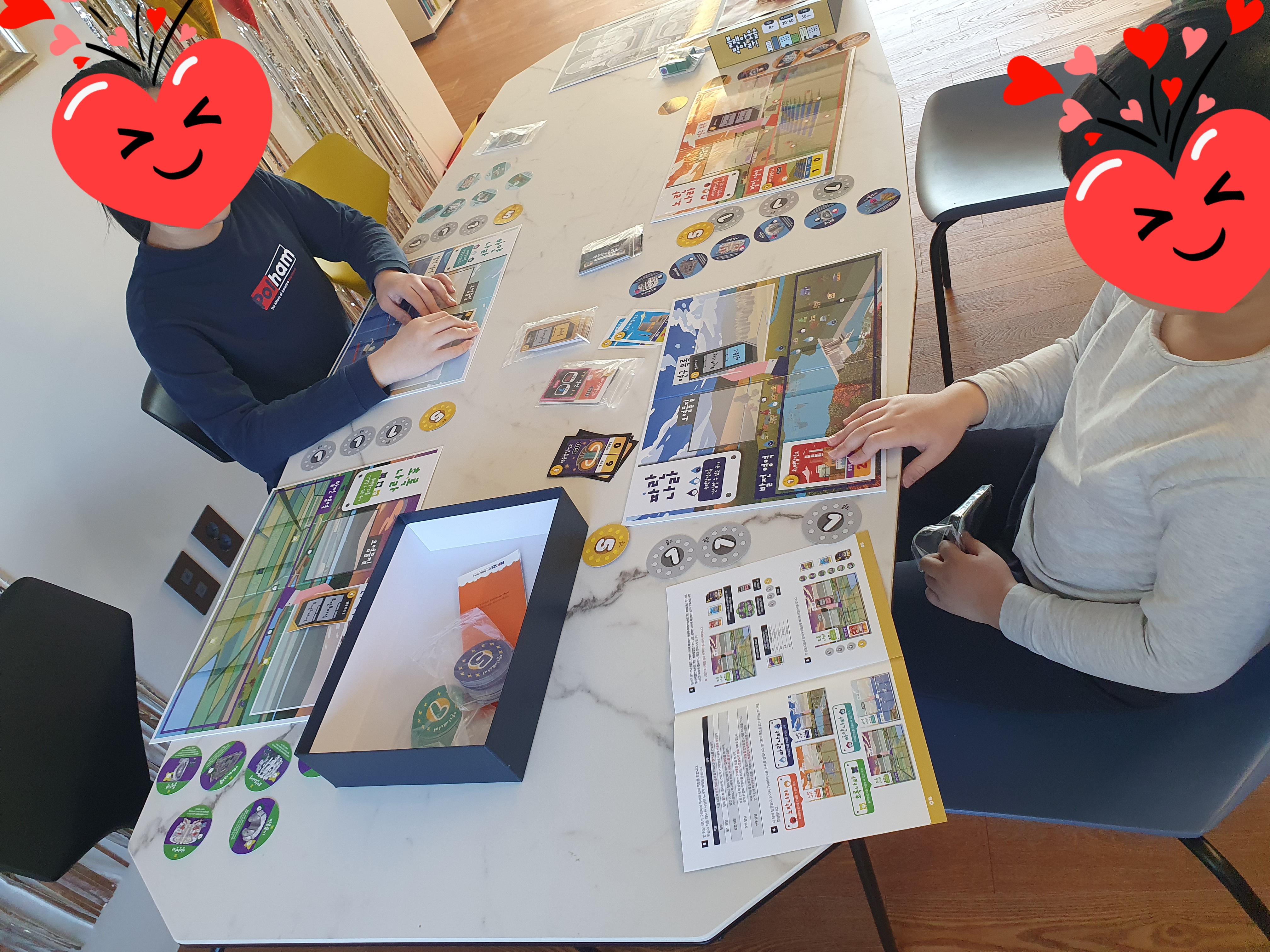 아이들이 신나게 보드게임 세팅 중입니다~ 음...구성하는 부속품도 많고 꽤 복잡해 보여서 처음 할 때는 좀 어려워 보일 수 있어요. 게다가 상자에 인원수가 많이 필요한 것으로 적혀 있어서 당황했었는데요. 막상 해보니 2-3명도 충분히 할 수 있는 보드게임이었어요~^^