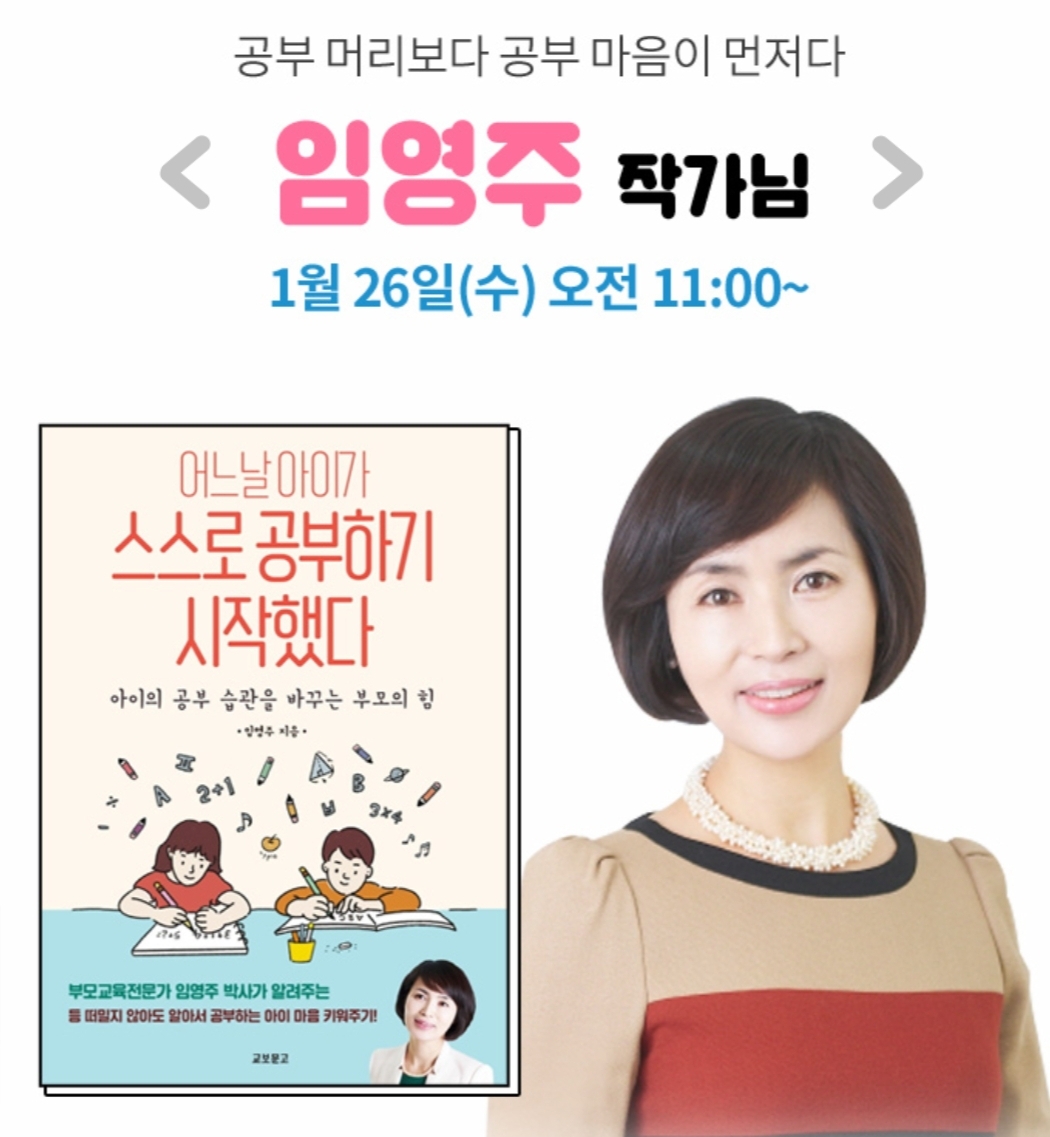 교보문고에서 자녀교육 랜선 특강을 한다고 해요. 요즘 교육과 관련해서 다양한 책들이 나오고 있는데요. 책을 쓴 작가님들의 강의를 들으며 궁금했던 내용을 물어볼 수 있는 좋은 기회인 것 같아요^^