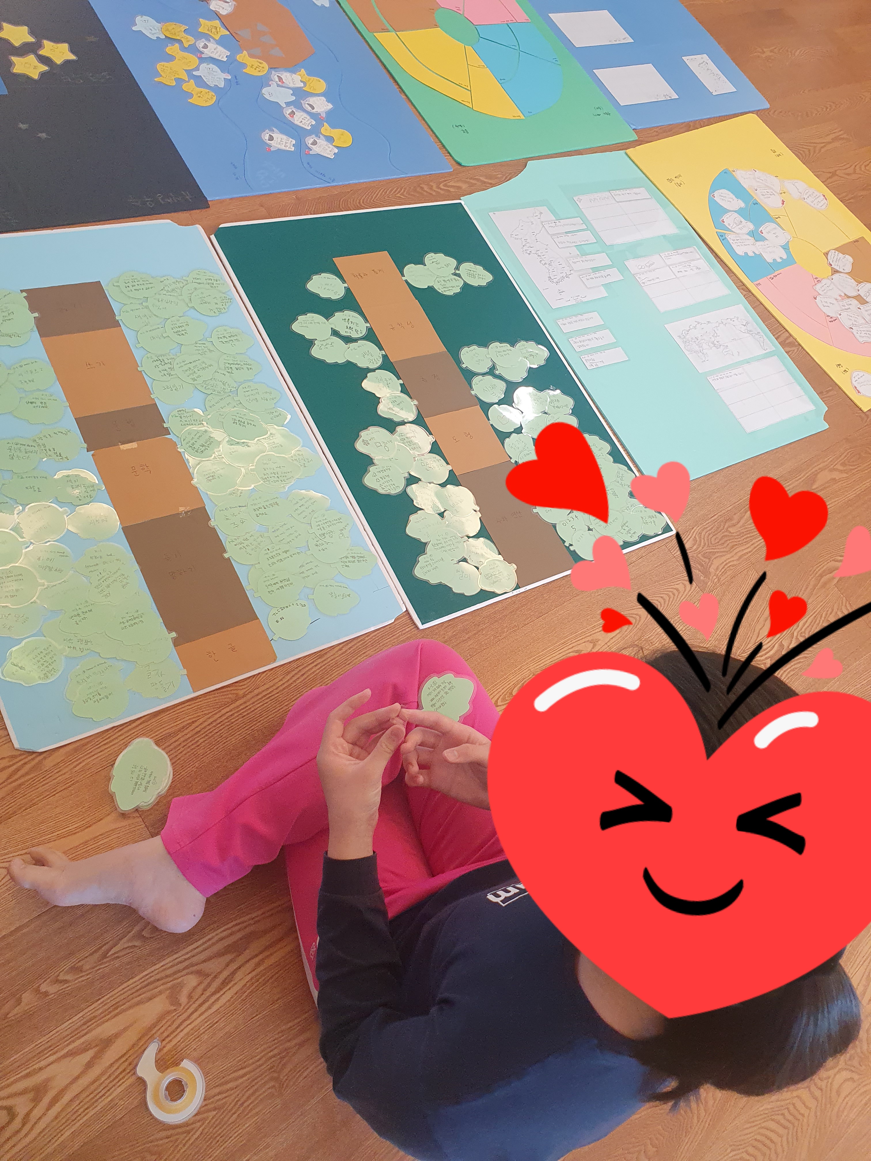 이렇게 하면 단원 내용을 가볍게 훑어보고 자기 표현으로 그 단원을 압축해서 정리하게 돼요. 그러면서 큰 틀 안에서 이 단원이 어디에 속해있는지 볼 수 있어서 좋아요. 사실 한번 만들어 놓으면 다시 보기는 어렵구요ㅋㅋㅋ 한번 정리해본다는 활동 자체에 의의를 두고 있어요. 저 판은 더 나중에는 복습용으로 다시 보지는 않고 그냥 뿌듯함을 위해 보관 중입니다ㅋ