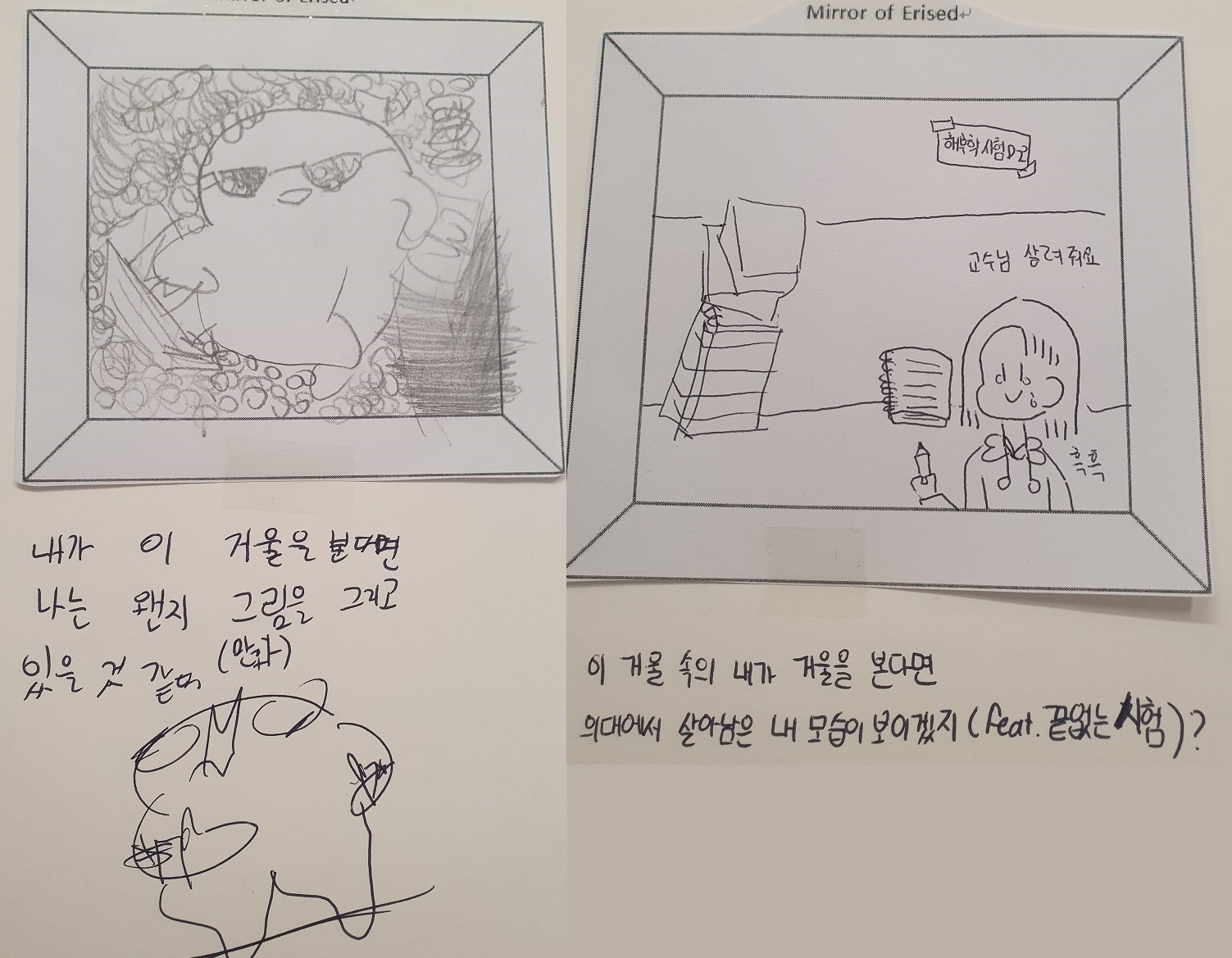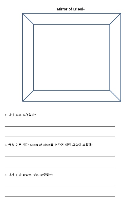 여기 Mirror of Erised가 있어요~ 이 거울을 들여다보면 내가 원하는 나의 모습이 보입니다. 여기에 비친 내 모습은 어떤 모습인가요? 비싼 옷을 입고 맛있는 음식들을 먹고 있나요? 인기가 많아서 친구들에 둘러싸여 있나요? 엄청난 상을 받고 세상의 주목을 받고 있나요? 내가 원하는 나의 욕망은 무엇인가요? 또 내 꿈은 무엇일까요?
