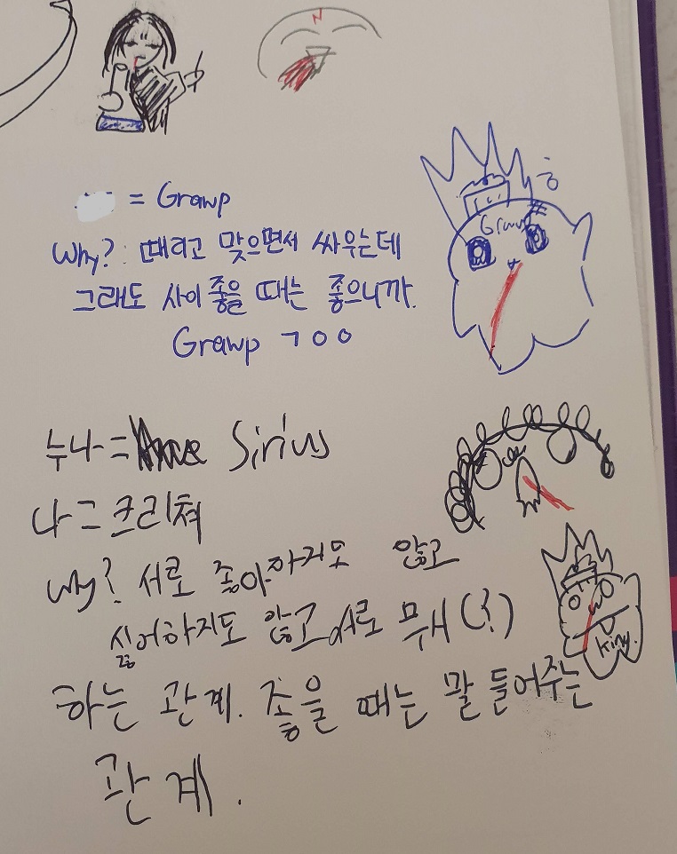 어... 하고 많은 캐릭터 중에 Grwap과 크리처가 나왔어요. 둘 다 인간도 아닌 것들! 아니 이 활동은 좀 괜히 시킨 것 같습니다 ㅋㅋㅋㅠㅠ Grwap은 무식하니 힘만 세고 멍청하고 맨날 때리고 싸운다고 골랐다는데 그래도 마무리는 사이 좋을 때는 좋다며 'Grwap 귀엽~' 하고 무마하네요? 크리처는 맨날 증오하고 미워하고 말도 안 듣는데 그래도 다음 편 가면 착해져서 마음 좋을 때에는 말도 잘 듣고 착할 때도 있다며 변명해주네요. 저기 그림 속 캐릭터들 다들 입에서 한 줄기씩 피 토하는 거 보이십니까? 아놔 ㅋㅋㅋㅋ 이 활동은 추천해야 할지 말아야할지 저도 모르겠습니다~ 아하하 ^^;