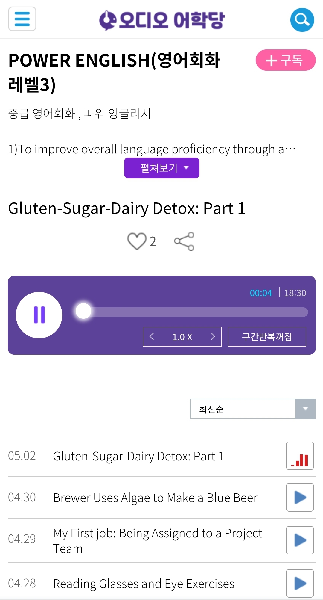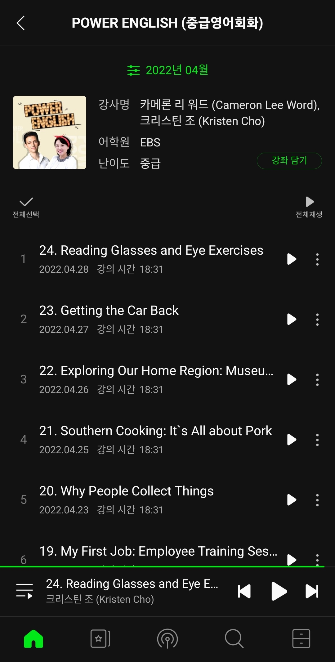 강좌 목록 보이시죠? 위의 멜론에서 보였던 것보다 최신 강좌가 더 빨리 올라와 있어요. 다른 음악은 듣지 않고 최신 내용 좀 더 빠르게 보길 원하시면 오디오 어학당이 좋을 것 같습니다~