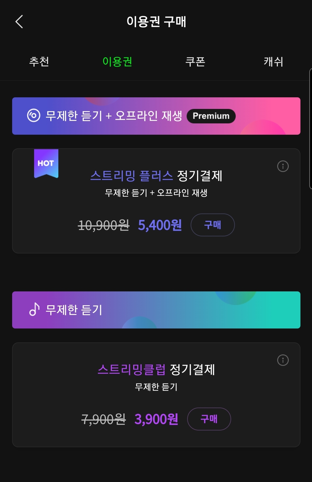 저희는 오프라인 재생은 필요 없어서 스트리밍 클럽 무제한 듣기로 월 3,900원짜리 이용 중입니다~ 이걸로 음악도 듣고 영어도 들어서 좋아요 ㅎㅎ
