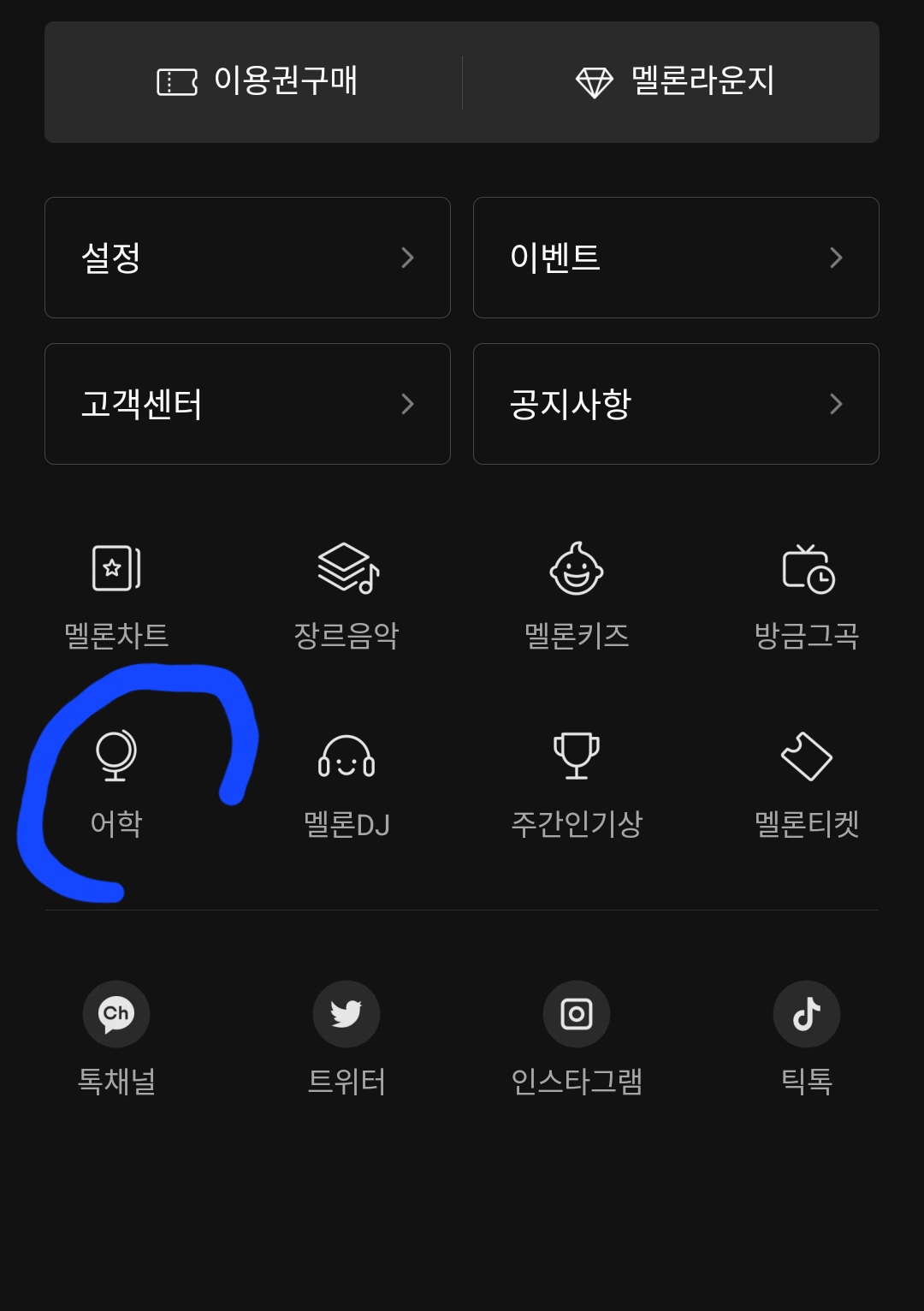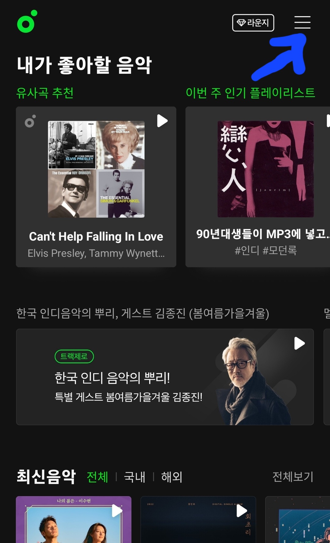 저희는 멜론을 이용하고 있어요. 멜론 홈 화면에서 저 오른쪽 위 작대기 세 개 있는 메뉴 버튼 누르시면 다음 화면이 나옵니다.