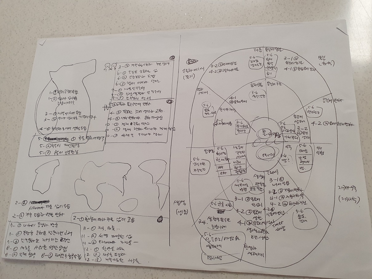 국어, 수학은 각각의 큰 대단원마다 해당하는 나뭇잎을 붙여줬어요. 국어는 읽기, 쓰기, 말하기, 듣기, 문학, 등등으로 나누어져있고 수학은 수와 연산, 도형, 규칙성, 측정, 경우의 수 등등이었던 것 같아요. 과학과 사회는 위의 그림처럼 각각의 단원 어떻게 나눌까 엄청 고민하면서 표로 만들었었는데요. 어... 이번에 교육과정 개정되었다고 하니 자세한 분류는 어차피 또 다시 나눠야 할 것 같아요;;;; 대충 과학은 운동과 에너지(물리), 물질(화학), 생명(생물), 지구와 우주(지구과학) 파트로 나뉘고, 사회는 지역과 관계된 내용, 역사와 관계된 내용, 그 밖의 다른 내용들로 나눠서 묶었습니다.