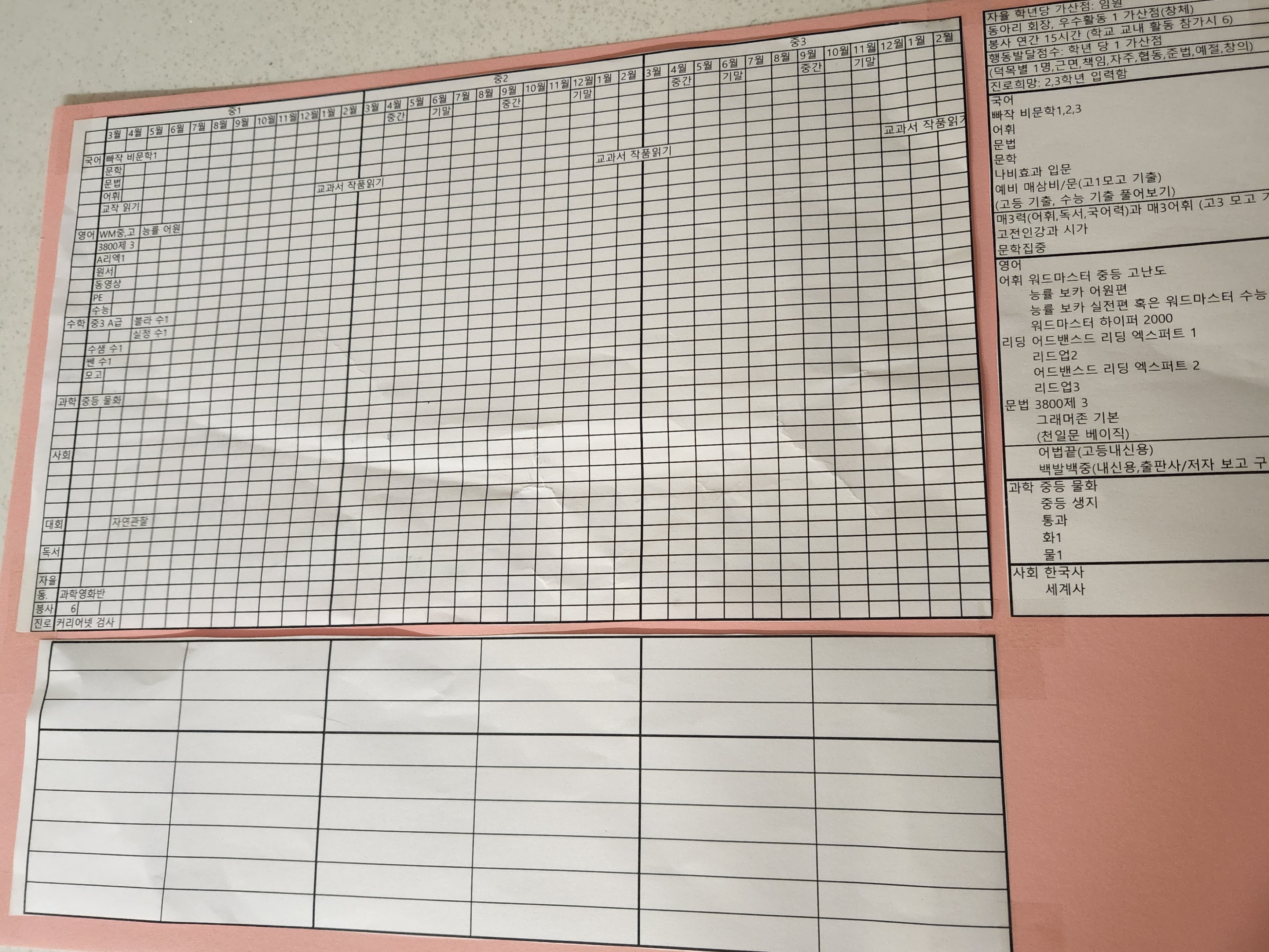 큰 표는 보시다시피 중1, 2, 3학년 시기에 따라 월별로 나눠놓은 표인데요. 주요 과목과 독서, 자동봉진 내용을 한 눈에 볼 수 있게 정리하려고 해요. 진도 나가는 상황에 따라 채워나가면 이걸 보면서 불안함도 줄어들 수 있고, 어느 부분을 더 채워야 할지도 잘 보일 것 같아요~ 오른쪽 작은 네모에는 각 과목별 향후 계획을 미리 적어놨는데요. 어쩌다보니 이거 출력하고 나서 조금 더 수정해서 위 사진은 최종본은 아닙니다 ^^; 일단 최종본 다시 확정한 다음에는 여기에 손으로 추가하면서 아이와 앞으로 3년간 내용 잘 채워볼 예정입니다 ㅎㅎ 아래 빈칸은 독서에 관한 내용으로 채울 예정이에요. 독서기록장 한 학기에 대략 5-7권 정도면 좋다는 이야기를 듣고 만들어봤습니다. 각 과목별 자세한 내용은 아래에 올려볼게요