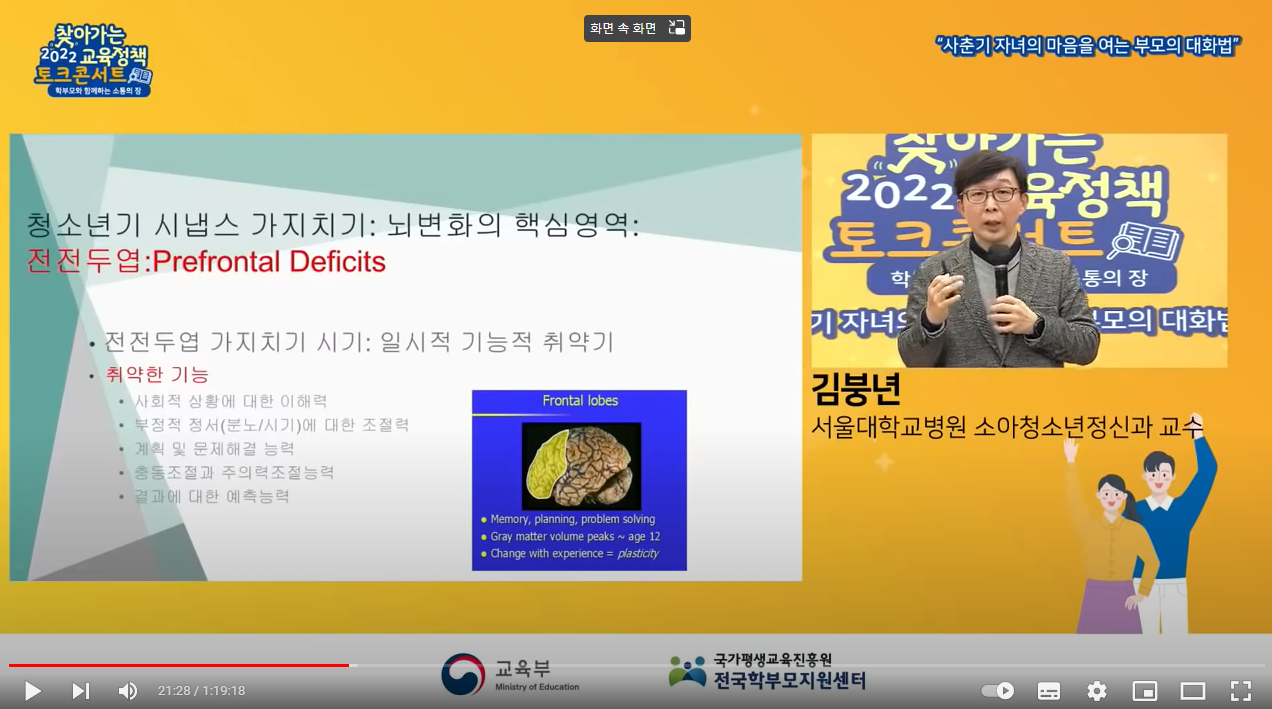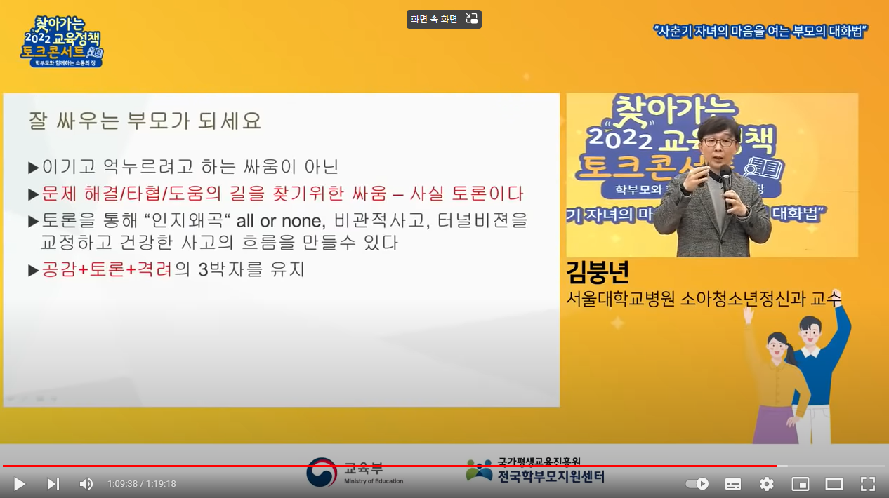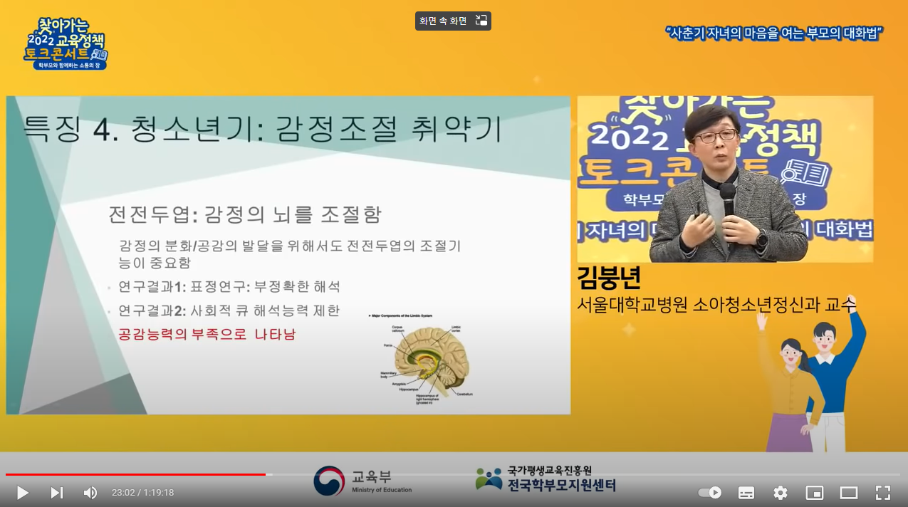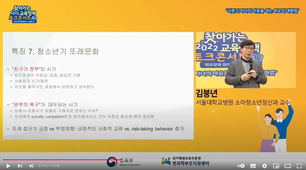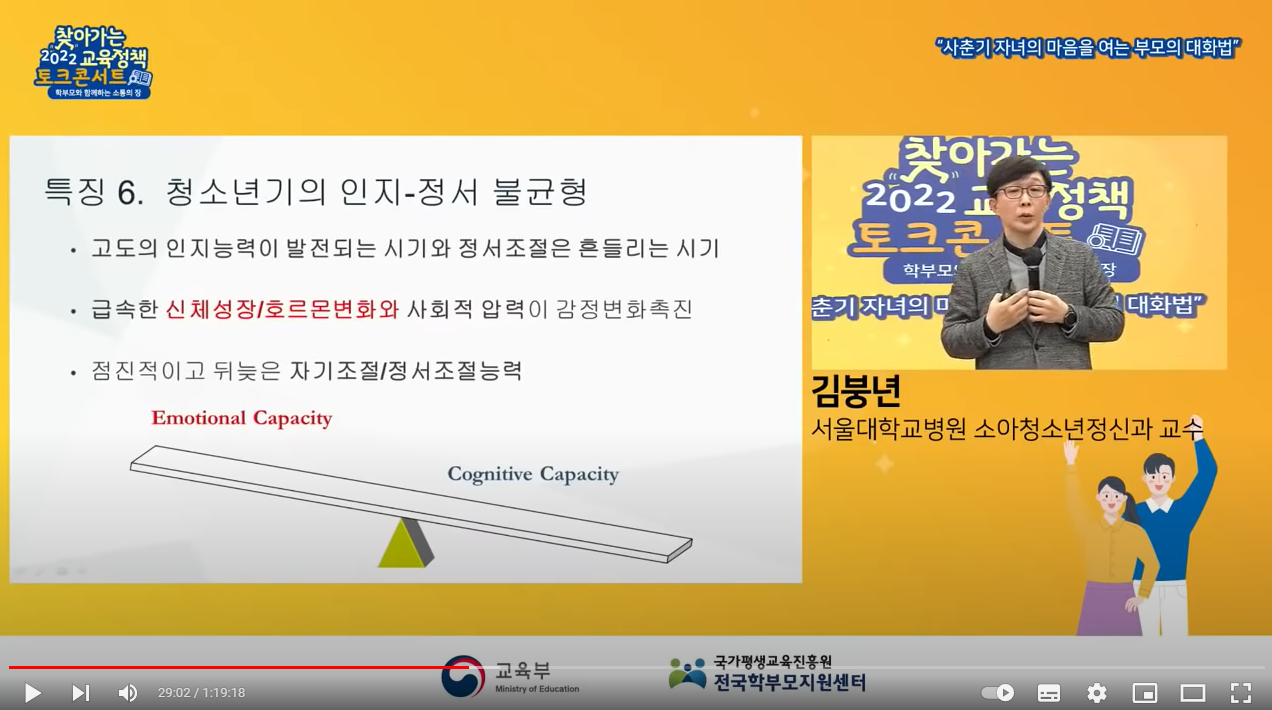 [2022 찾아가는 교육정책 서비스] : 1부, 사춘기 자녀의 마음을 여는 부모의 대화법(김붕년 교수) - YouTube
