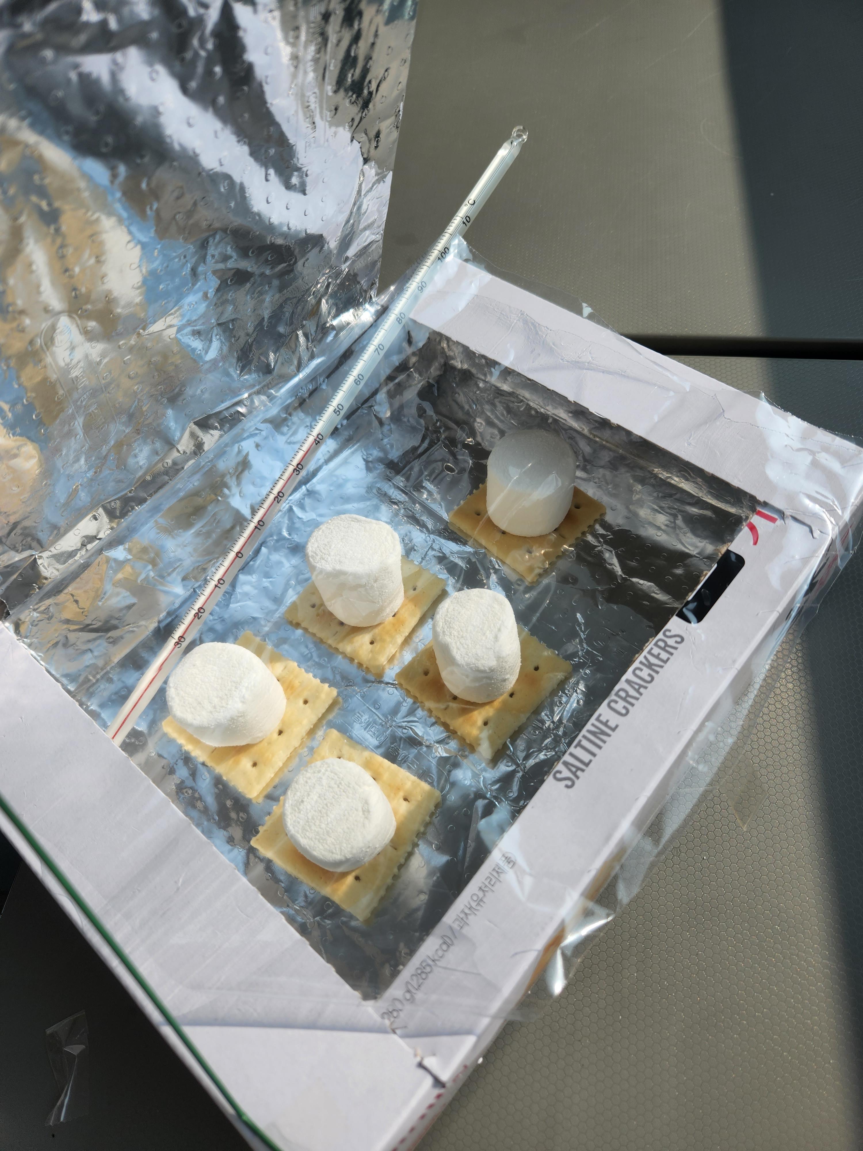 뒤늦게 화력을 더하기 위해 돋보기 추가했습니다! 그러나 해는 점차 더 기울어가고 오븐 온도는 41도 ㅠㅠ 레이저 온도계도 있어서 마쉬멜로우 표면온도도 재봤더니 36도 나오네요. 애들이 그건 체온 아니냐고, 오븐 아니라 손에 쥐고 있어도 나오는 온도 아니냐고 깔깔댑니다 ㅋㅋㅋ 뭐... 집에서 하는 실험은 망해보는 것도 좋아요~ 오늘은 이쯤에서 태양 오븐은 망했다고 종료하고 스모어 쿠키나 진짜 오븐에 구워서 만들어보기로 했습니다~