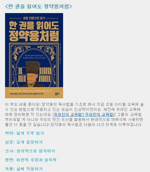 그러고보면 예전에 아이들 독서관련 교육 서적 추천하는 글에서도 정약용 선생님의 독서 공부법 추천한 적 있었어요.