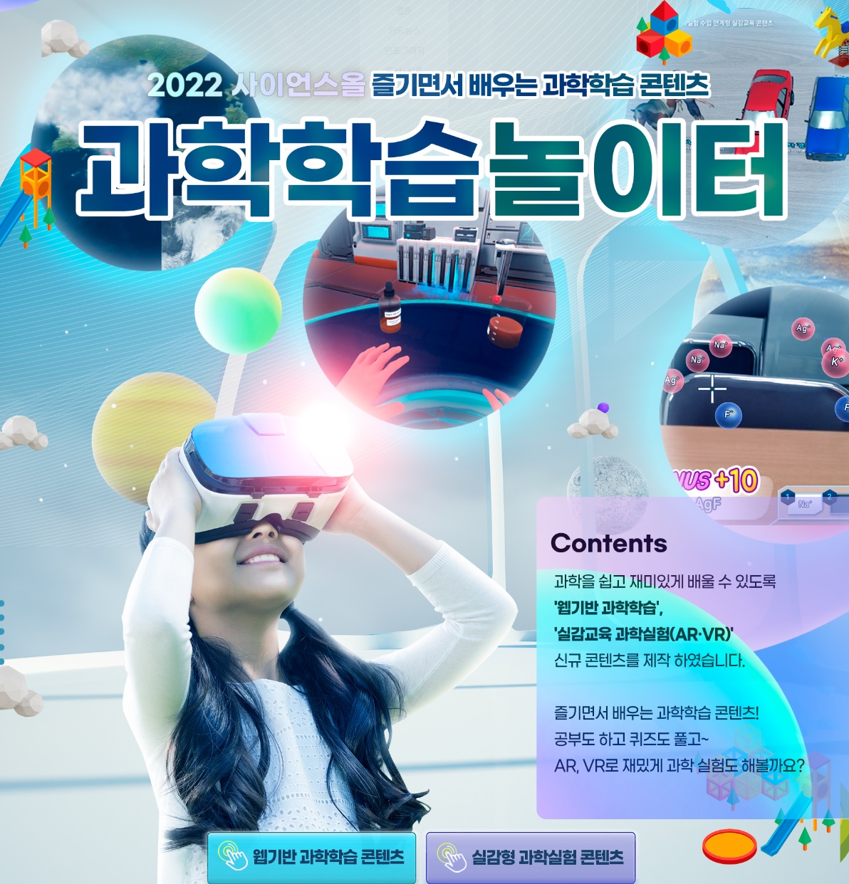 위의 링크로 들어가시면 바로 과학학습놀이터 보실 수 있어요~ 웹기반 과학학습 콘텐츠랑 실감형 과학실험 콘텐츠가 있어요~