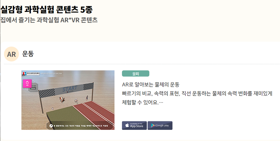 실감형 과학실험 콘텐츠는 어플 다운받아서 보는 AR 혹은 VR 콘텐츠라고 되어 있어요. 위의 그림은 운동에 대한 내용인데요. 이거 말고도 유전, 온대저기압, 이온결합, 2050년 지구를 구하라 게임 같은 것들이 있네요~ 중학교 1학년인 첫째가 볼만한 내용일 것 같아서 찜해놨습니다 ^^