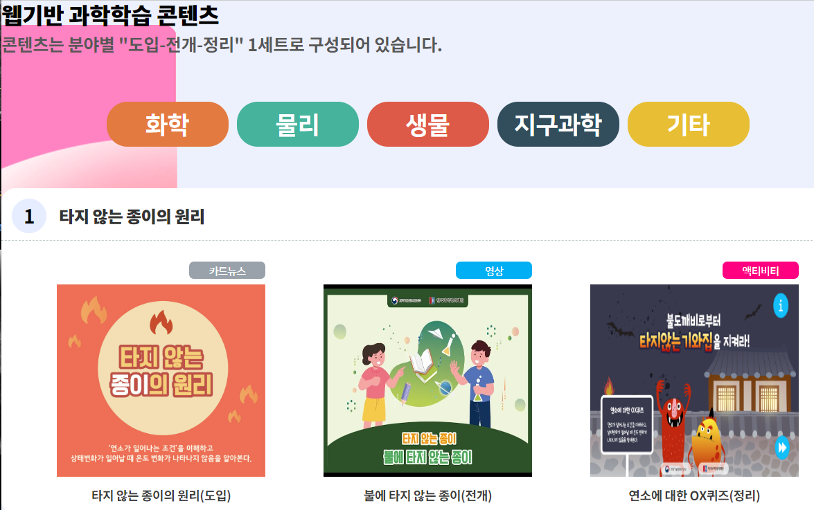 웹기반 과학학습 콘텐츠는 화학, 물리, 생물, 지구과학, 기타 분야마다 한 세트씩 있는데요. 도입 - 전개 - 정리 내용으로 구성되어 있다고 해요. 저희도 아직 못 봤고 방학 중 심심할 때 볼 예정입니다 ㅋ 어떤 내용이 있나 보니 제법 재밌어 보이는 내용들이 있어요. 초등 4학년 둘째가 좋아할 것 같은 내용입니다 ^^