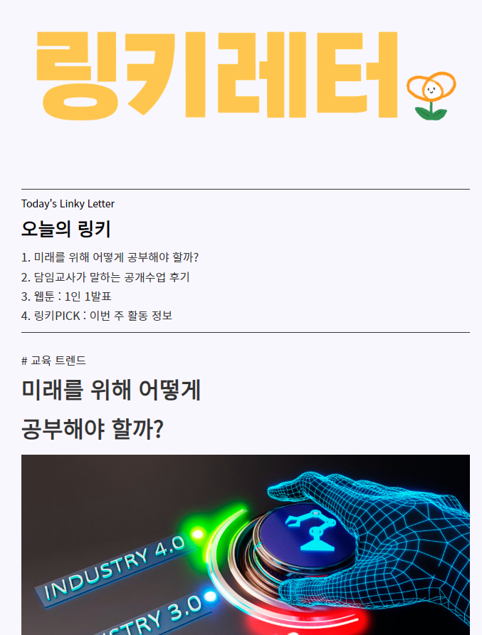 아이들이 행복한 성장을 꿈꾸는 링키레터입니다. 매주 화·목요일, 링키레터를 만나보세요! 엄선한 교육 정보를 보기 쉽게 전해드립니다. ✔ 1015 보고서 – 요즘 아이들의 진짜 이야기 ✔ 교육