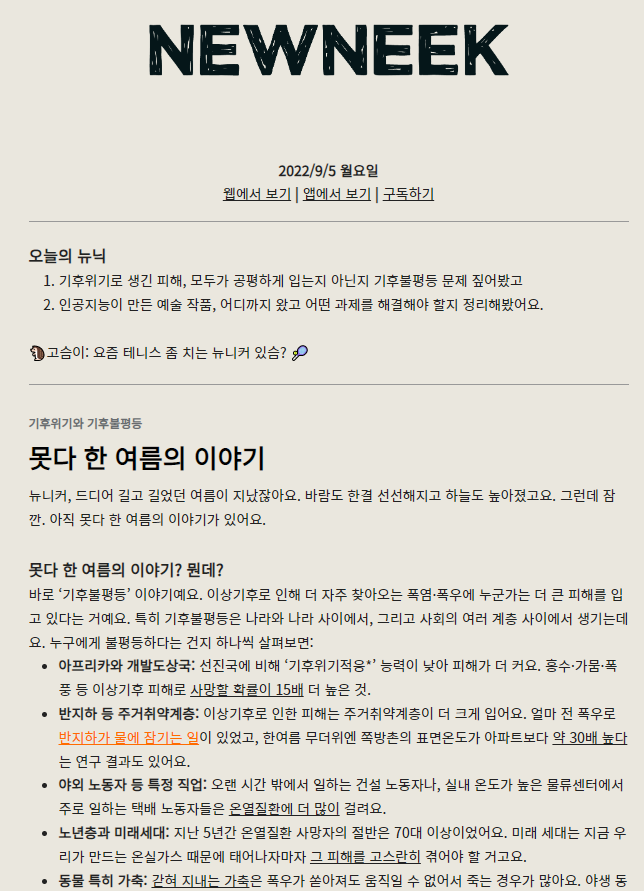 어.. 이건 사실 제가 경제 잘 몰라서 보려고 구독 신청해서 보고 있었는데요. 간단하게 세상 돌아가는 흐름 짚어주는 내용이라서 일부 내용은 아이들과 함께 봐도 괜찮더라구요. 얼마 전 어린이 신문에서 콩고가 열대우림을 경매에 내놔 개발하려고 해서 걱정이라는 기사를 읽었는데요. 그냥 그런가 보다 했었는데 뉴닉에 보다 자세하게 러시아-우크라이나 전쟁과 콩고의 열대우림 경매가 어떻게 연결되었는지 설명이 나와있어서 함께 보니 좋았어요. 뉴닉은 교육에 활용하신다면 부모님이 먼저 보시고 활용할 만한 내용만 아이와 함께 이야기 하면서 보시면 좋을 것 같습니다 ^^