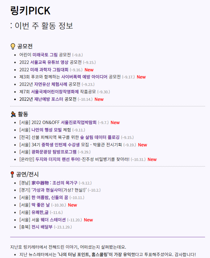 이렇게 그 때 그 때 해 볼만한 활동 정보도 있어서 아이들과 한 번 살펴보면서 함께 해볼만한 것 찾아봐도 좋은 것 같아요 ^^ 이런 공모전이나 체험은 정말 아이가 즐거워 하면 해보는 것도 좋지만, 아무리 유익한 내용이라도 아이가 그닥 하고 싶어하지 않으면 마음 편히 안 하고 지나가는 것도 좋은 것 같습니다~ ㅎㅎㅎ