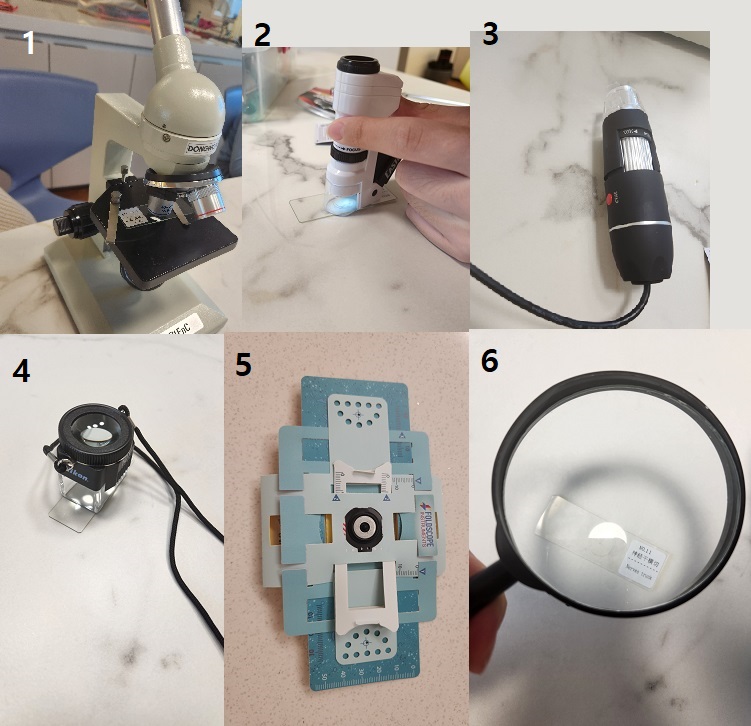 간단히 요약해보자면 광학현미경은 비싸고 다루는게 편하지는 않지만 가장 깨끗하게 관찰할 수 있습니다. 휴대용 현미경은 싸고 간편해서 뭐든 보기 좋은데 배율이 하나로 고정되어 있어요. 가볍게 집에서 관찰해보기에는 이 제품이 제일 만만해보입니다 ㅎㅎ 다만 이 두 가지는 촬영이 쉽지 않아서요. 관찰한 결과물을 사진으로 남기고 싶으시면 USB 현미경 사진이 가장 깨끗합니다.....만.....;;; 어... USB 현미경은 스마트폰에 연결해서 사용해야 하는데요. 연결해서 쓰는 어플이 최신 버전은 연결이 안된다고 해요. 그래서 구버전으로 바꿔서 설치해야 하는데... 이게 되다 말다 합니다 ㅠㅠ 한 어플 사용하다가 안되면 다른 USB 현미경 어플 검색해서 그거 구버전으로 바꿔보면 되기도 하는데요. 진짜 자꾸 되다 말다 해서 사용 자체가 좀 힘들어요. 용지걸림 현상이 디폴트인 복사기를 달래서 사용하는 기분이랄까요? 인내심이 많이 필요한 제품입니다 ㅠㅠ 이번에 받아본 폴드스코프는 종이현미경인데요. 음.. 싸고 간편한데 아주 깨끗하게 잘 보이진 않네요. 저희가 아직 스킬이 부족해서 그런 것 같기도 하고... 정말 이런 것도 있구나 하고 체험해보는 정도로 보시는 게 좋을 것 같습니다ㅎㅎ 현미경 비용이 부담되지만 말라리아 검사를 위해 현미경이 꼭 필요한 지역을 위한 적정기술로서는 정말 획기적이라고 생각됩니다 ^^ 루뻬 확대경은 사진으로 관찰결과 남기기는 힘들지만 간편하게 들고다니며 보기는 괜찮아요. 돋보기는 으음... 정말 돋보기여서 그닥 많이 확대되지는 않습니다 ㅎㅎ