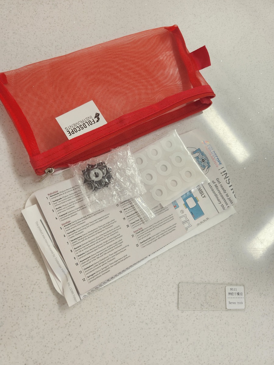 집으로 배달온 체험 키트를 개봉하니 이렇게 폴드스코프를 만드는 재료와 샘플 프레파라트가 들어있어요. 저희 프레파라트는 Nerve trunk가 왔네요 ^^