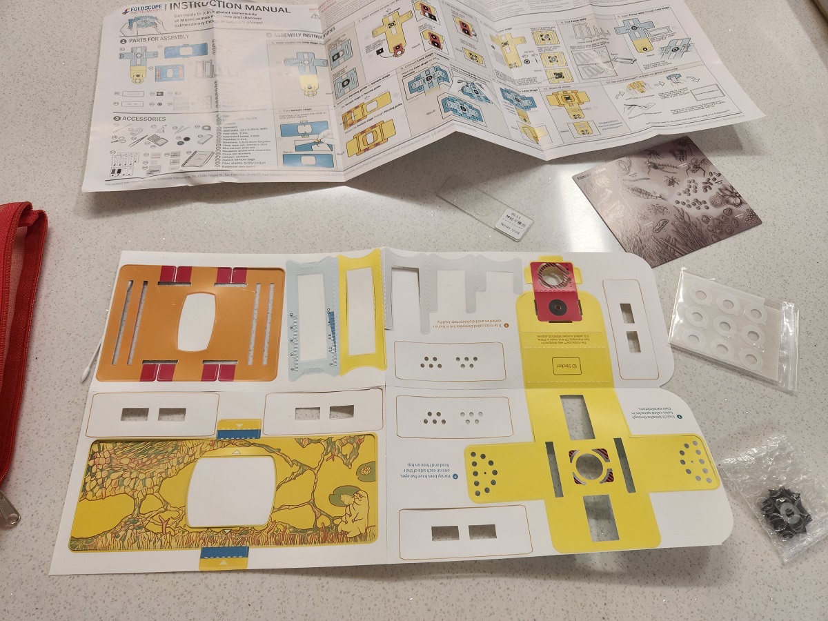 위쪽 종이는 설명서, 아래쪽 종이는 폴드스코프 재료에요. 종이 한 장과 렌즈를 가지고 실제 사용 가능한 현미경을 만들 수 있다니 진짜 신기한 것 같아요!