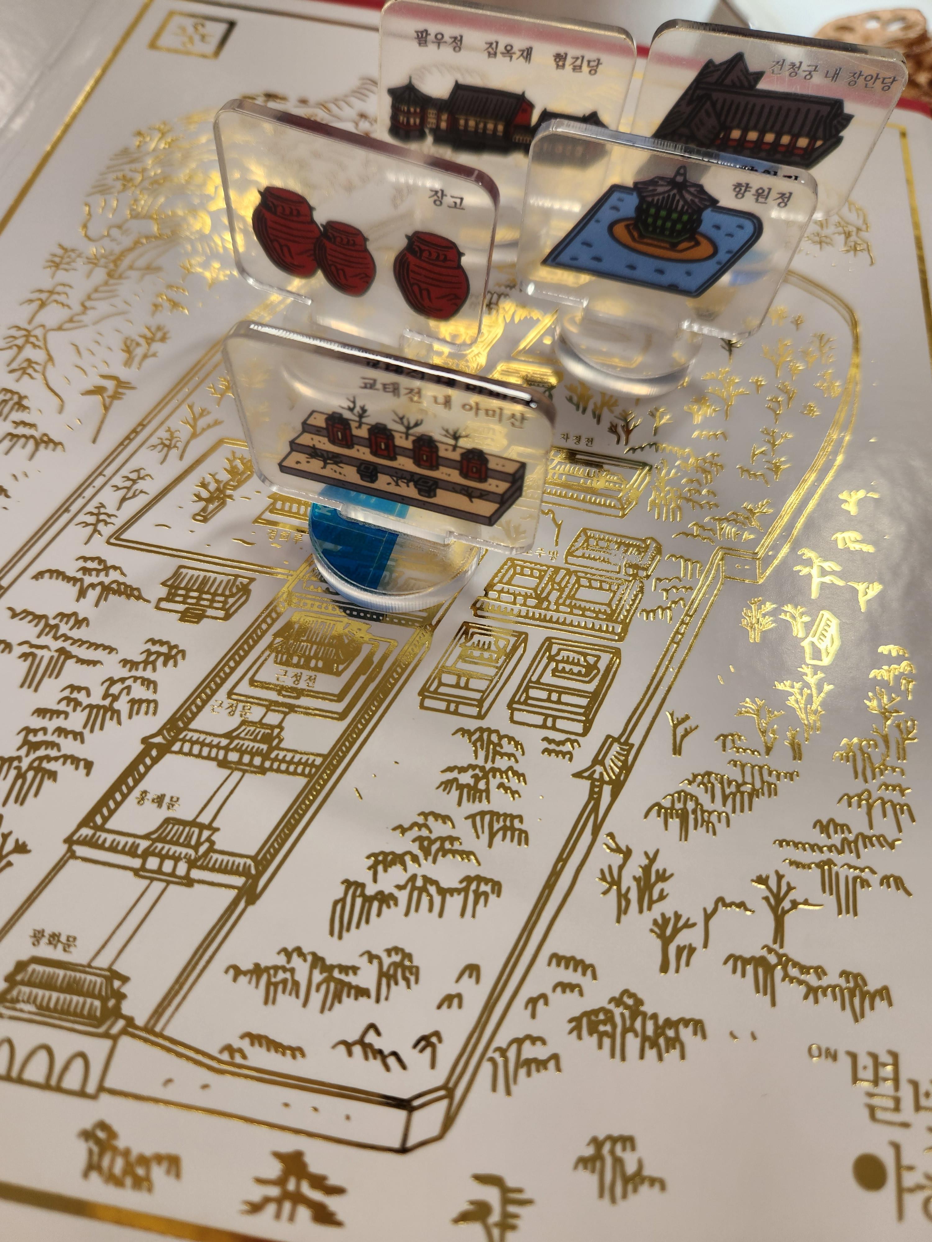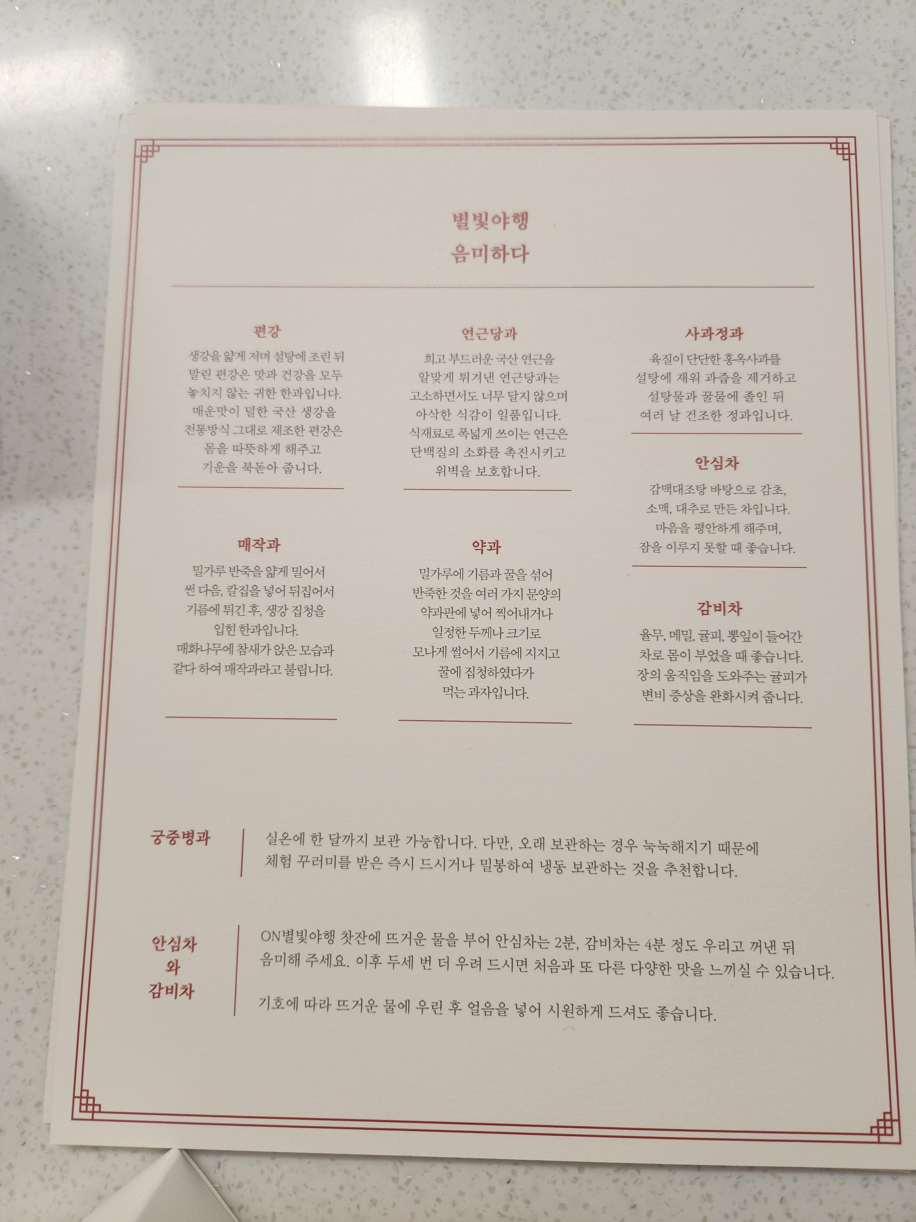 이렇게 투명 아크릴판으로 만든 이정표를 상자 뚜껑 안쪽에 있는 금박 지도 위에 올려놓으니 너무 예뻐요~ 차도 함께 우려서 간식과 함께 맛나게 먹어보기로 했습니다. 동봉된 설명에 QR 코드를 찍으니 함께 볼 수 있는 동영상이 나와요. 온 가족이 둘러앉아 영상 보면서 궁중 간식 즐겨봤습니다~ ㅎㅎ
