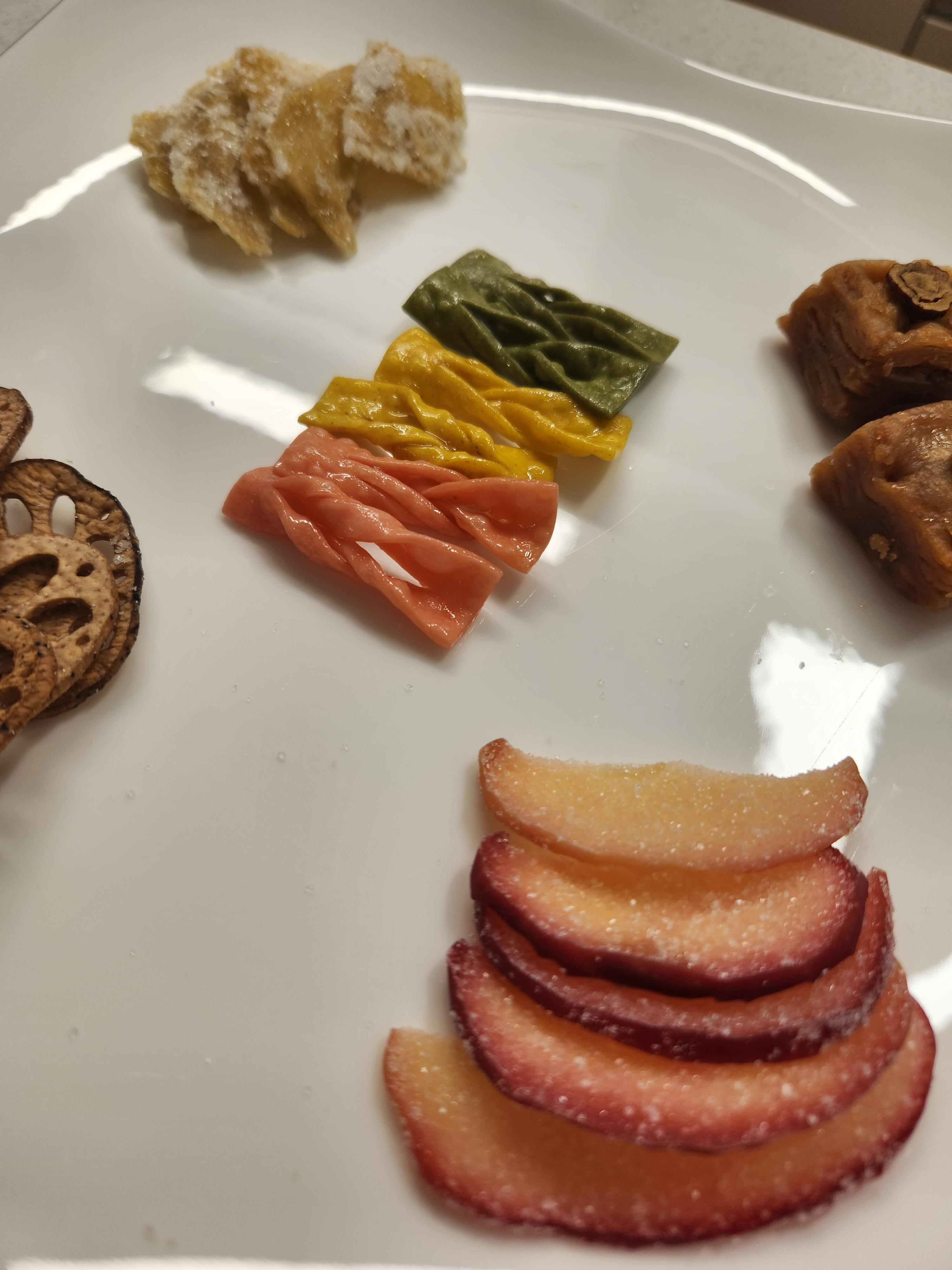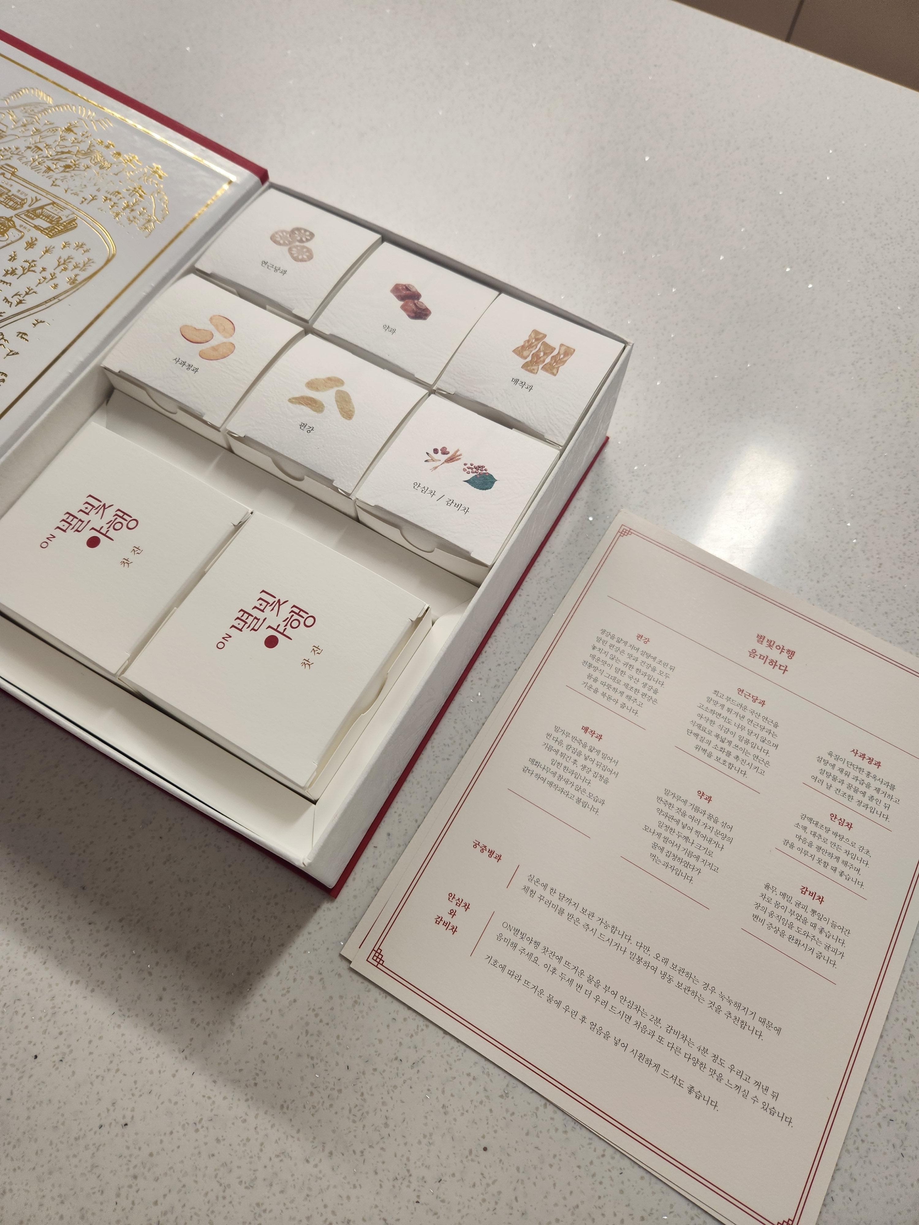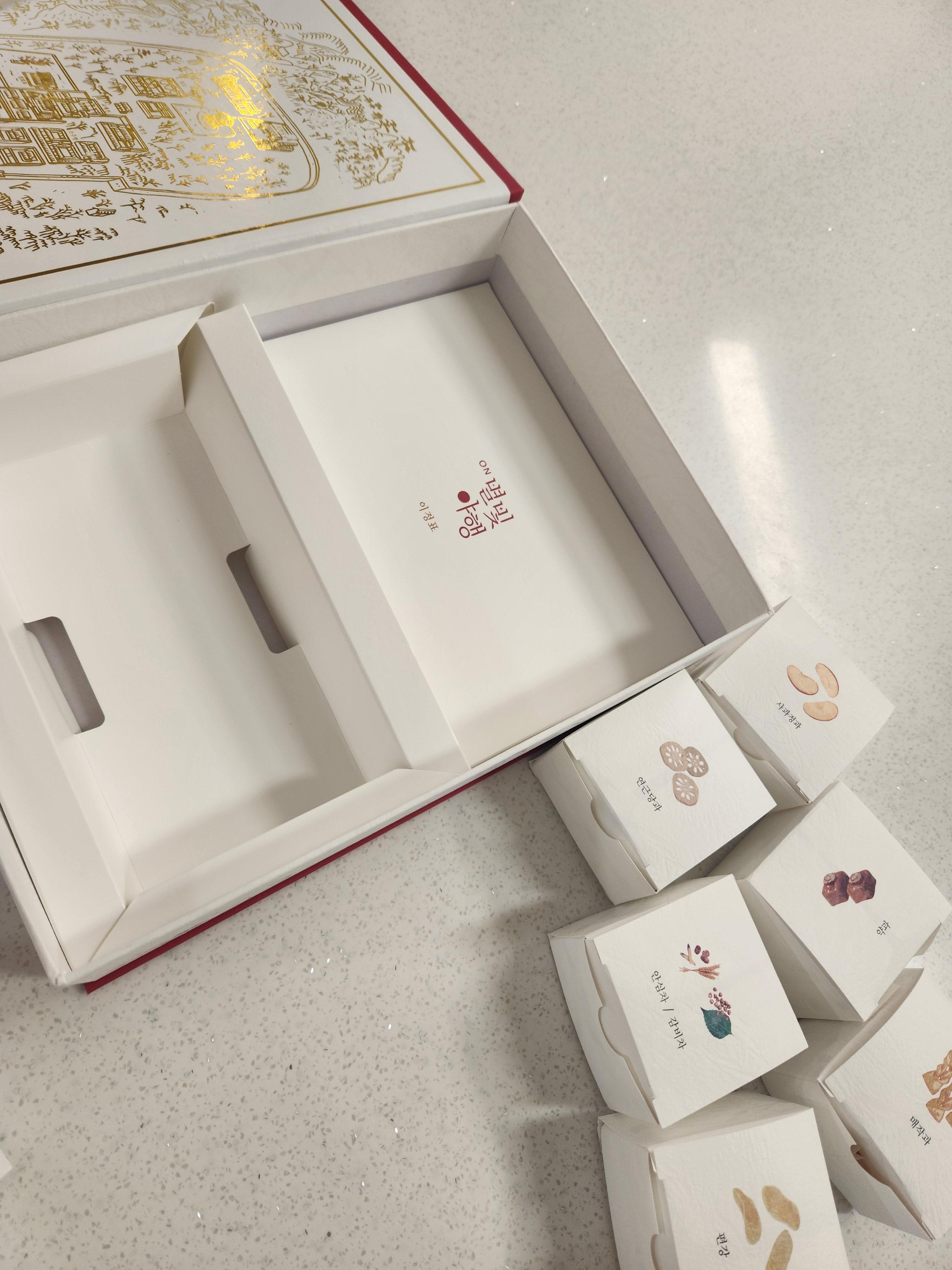 열어보면 상자 안에 이렇게 간식과 예쁜 찻잔이 들어있어요~ 사과 정과가 제일 먹어보고 싶었는데 연근당과, 편강, 약과, 매작과도 맛있어 보여요~