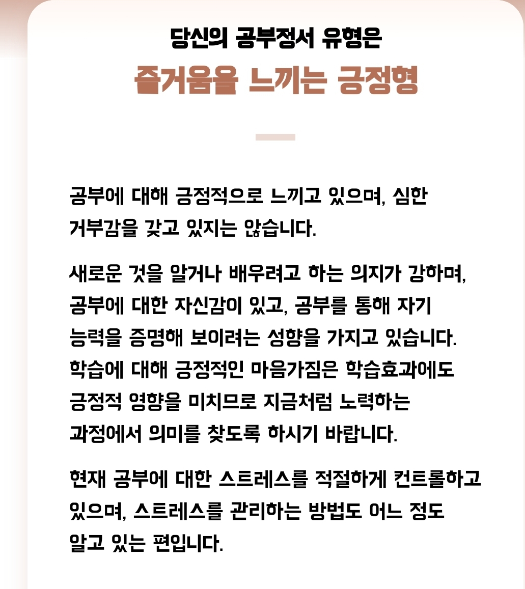 아이들 교육에 관련된 메일링 서비스를 꾸준히 받아보고 있는데요. 그 중 링키레터에서 공부정서 테스트가 있길래 아이들에게 시켜봤어요 ㅎㅎ 첫째와 둘째 둘 다 해봤는데요. 다행히 둘 다 '즐거움을 느끼는 긍정형'이라고 나오네요 ^^