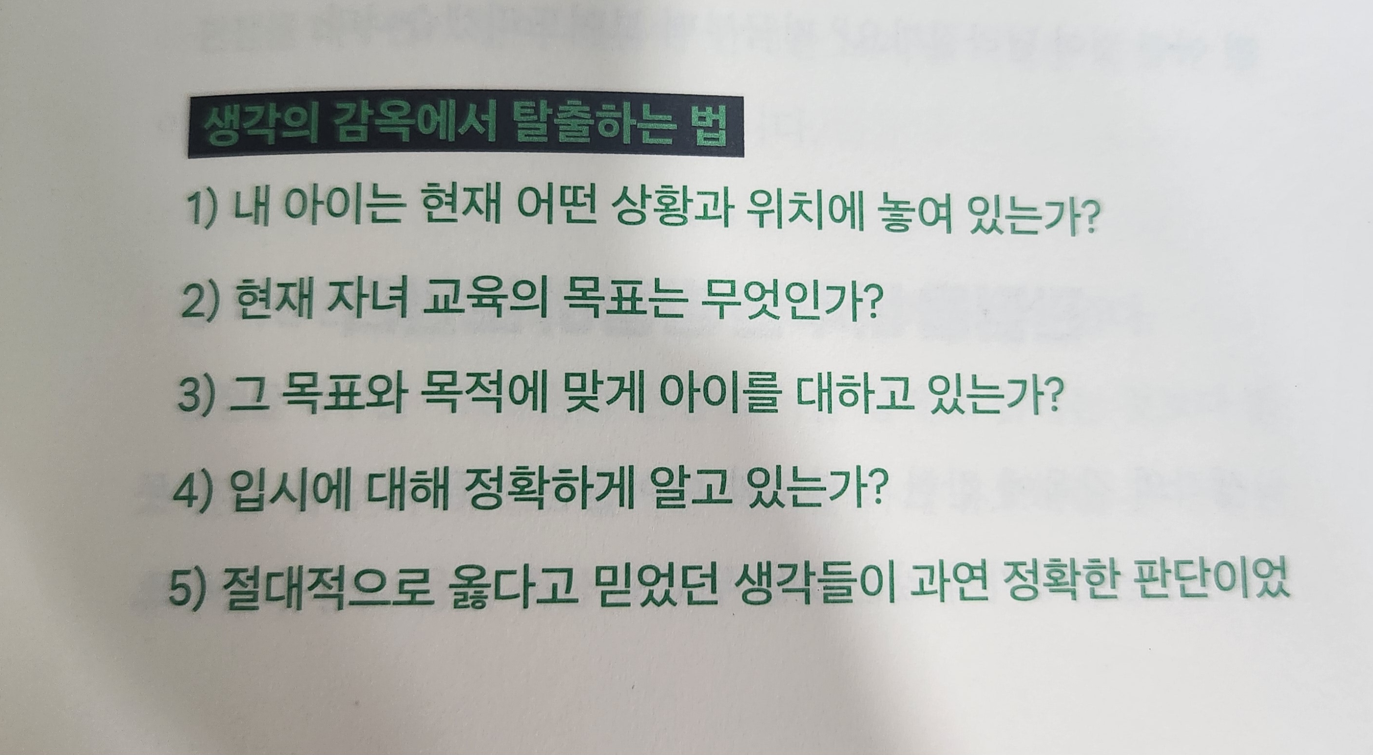 제목에서도 알 수 있는 것처럼 이 책은 일단 대입과 관련된 내용을 다루고 있어요. 그러면서도 교육의 기본적인 원칙을 잊지 않도록 되새겨준다는 점이 인상적이었습니다. 가장 핵심되는 것은 지피지기면 백전불태, 상황을 알고 내 아이를 알아서 목표에 맞춰 나아간다는 내용일 것 같습니다. 같은 상황이라도 목표가 다르다면 가는 길을 달라질 수 밖에 없으니까요. 이 책에서는 그 목표를 대입으로 잡고 그 과정을 안내해주는 길잡이 같은 책입니다. 책 앞표지 띠지에는 "초등 6학년이 되기 전 SKY에 올라타라!"는 자극적인 문구가 있는데요. 사실 초등 고학년에서 중학교 다닐 때 즈음 되면 부모가 끌고 가는 건 힘들고 아이가 스스로 해나가기 시작해야 하는 것 같아요. 그러니 공부에 대한 태도와 요령을 초등학교 6년 동안 잡아야 그 이후 학습적인 지식을 쌓아서 대입을 향해 갈 수 있는 건 맞는 말 같습니다.