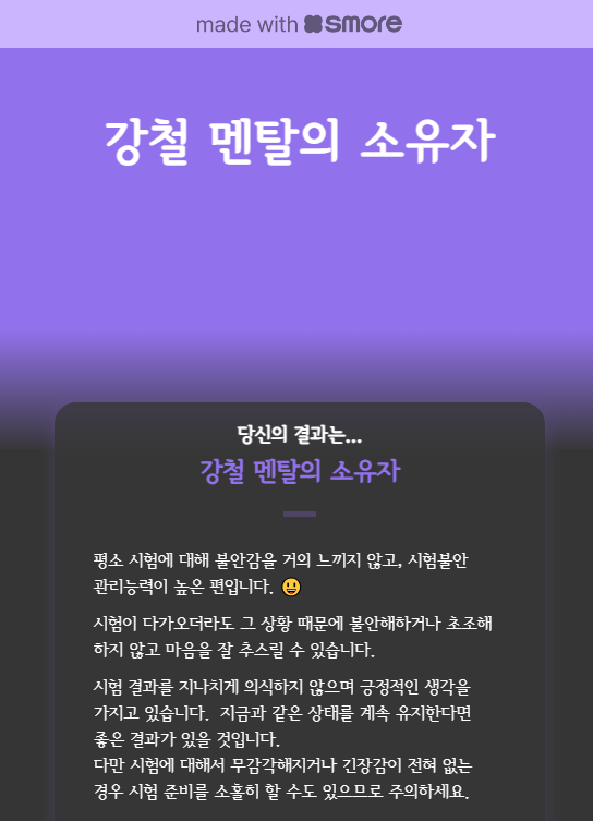 제가 보기에 상당히 시험에 대한 스트레스와 불안도가 높아보였던 아이라서 테스트로 시험 불안 정도에 대해 알아볼 수 있다니 한 번 확인해보고 싶었어요. 불안도가 높은 아이라면 그만큼 부모가 더 잘 지지해주면 되지 않을까요? 자, 아이의 시험 불안 테스트 결과가 나왔습니다!