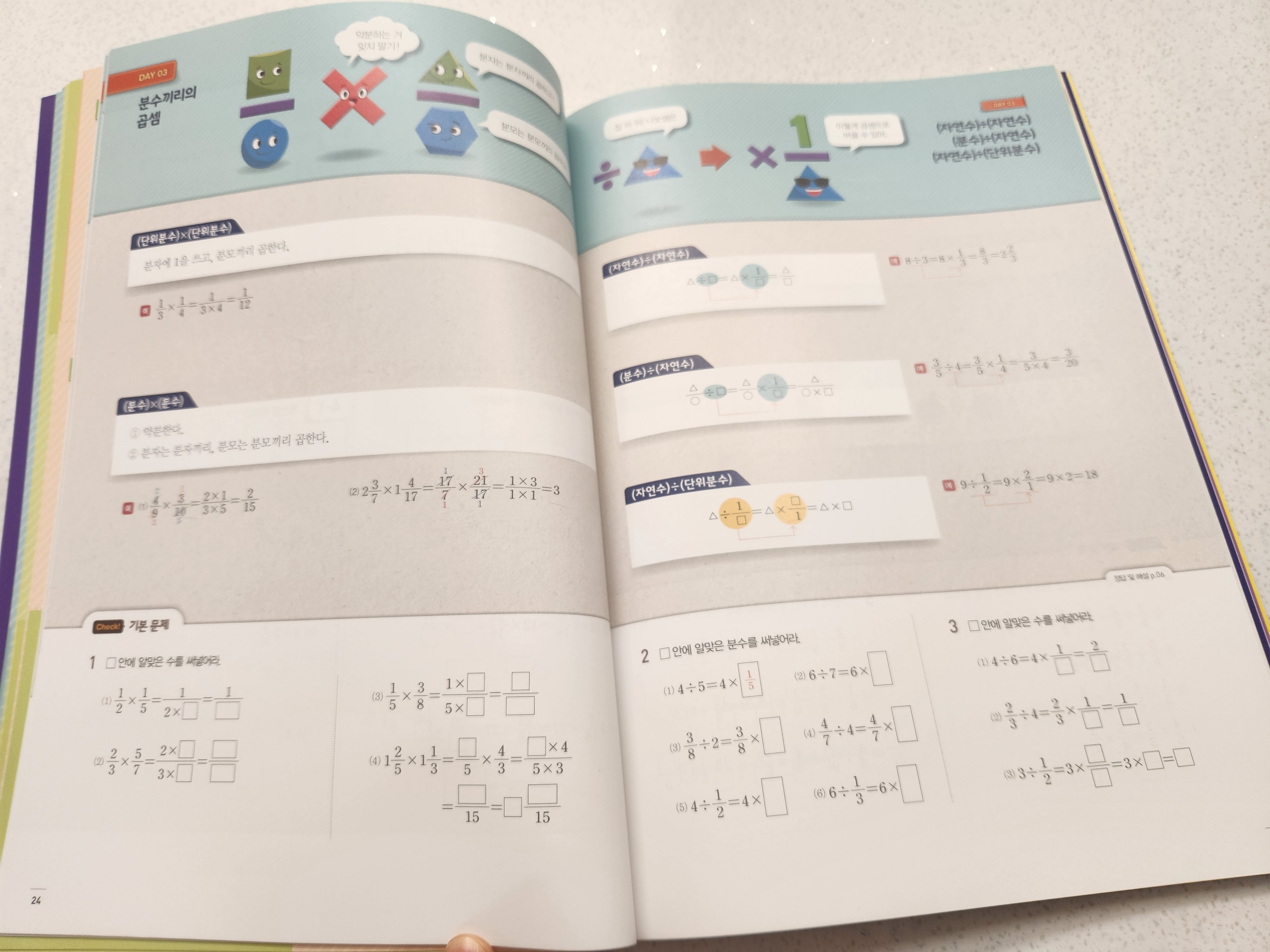 분수도 많이들 힘들어하는 부분인데요. 그런 부분들을 자세하게 설명해줘서 좋은 것 같아요. 이 책은 꼭 초등수학 마무리 할 때 보기보다 초등 수학 배우면서 그 때 그 때 같이 봐도 좋을 것 같아요 ^^ 다만 교과서에 나온 개념이 여기 모두 다 나온 것은 아니라서요; 이 책으로 배운 내용 복습하기에는 빠지는 내용이 많을 것 같아요. 다른 책으로 쭉 훑어볼 때 같이 보기 좋은 책 같습니다 ^^
